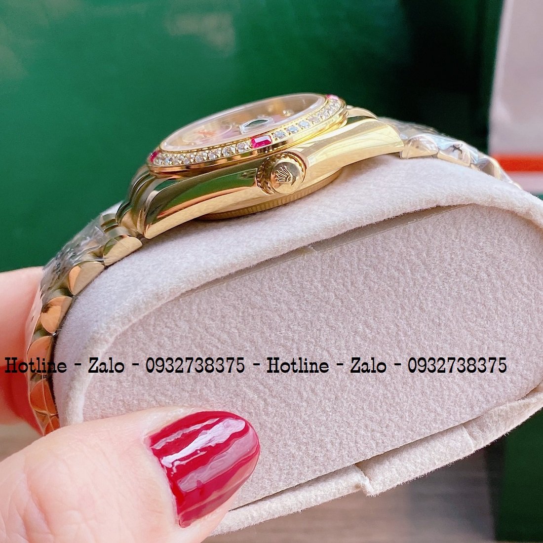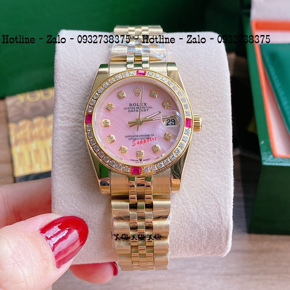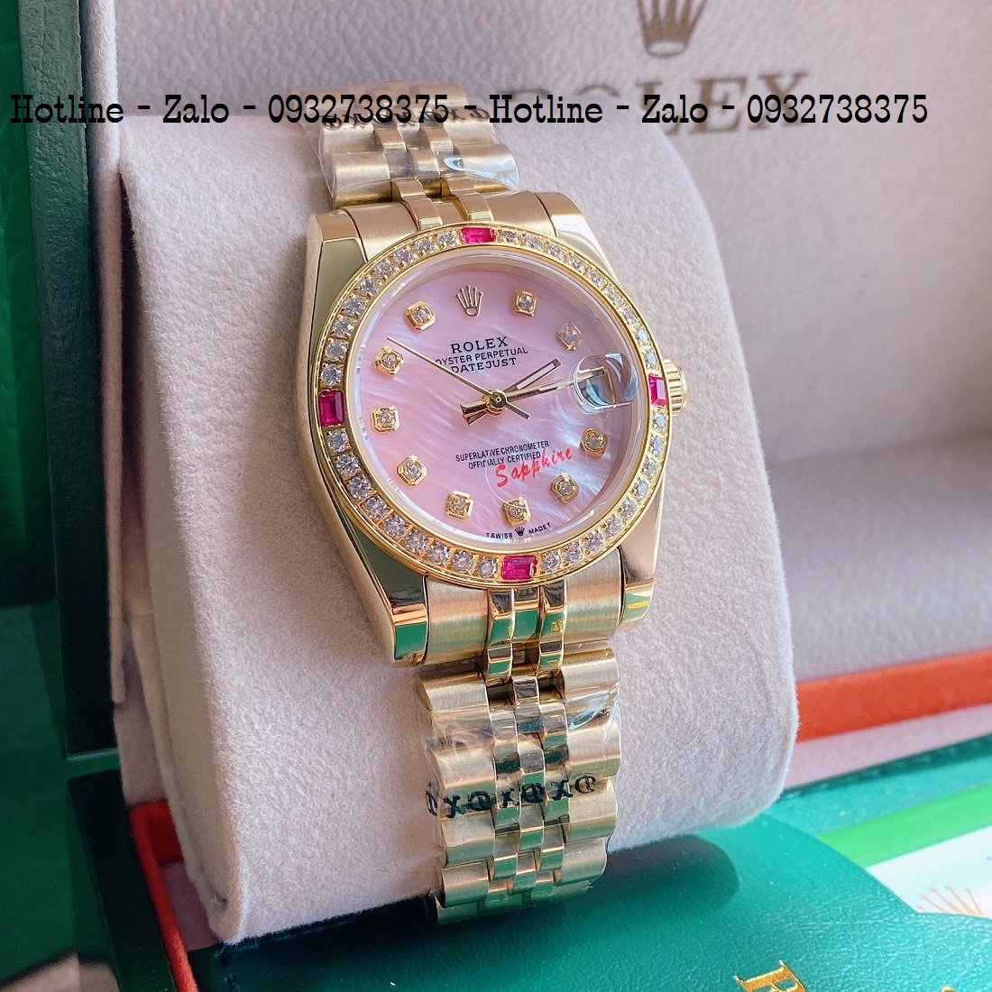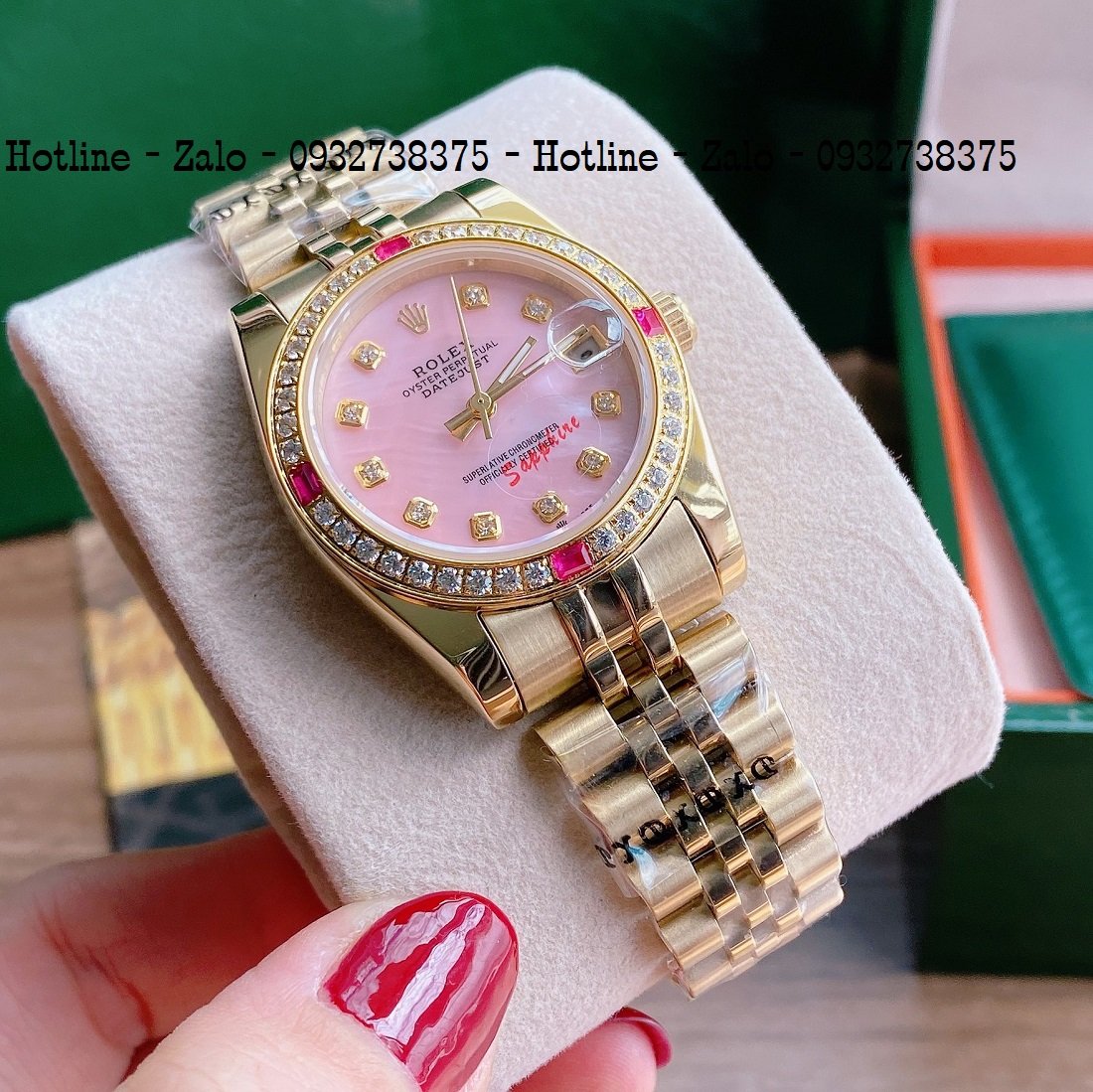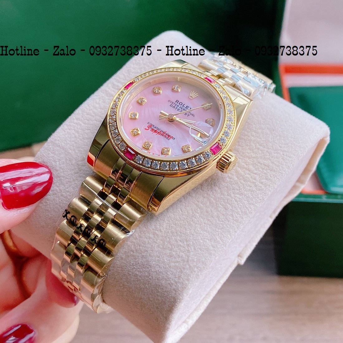 - Đồng Hồ Nữ Rolex Viền Đá Dây Vàng Mặt Hồng Ngọc 32mm