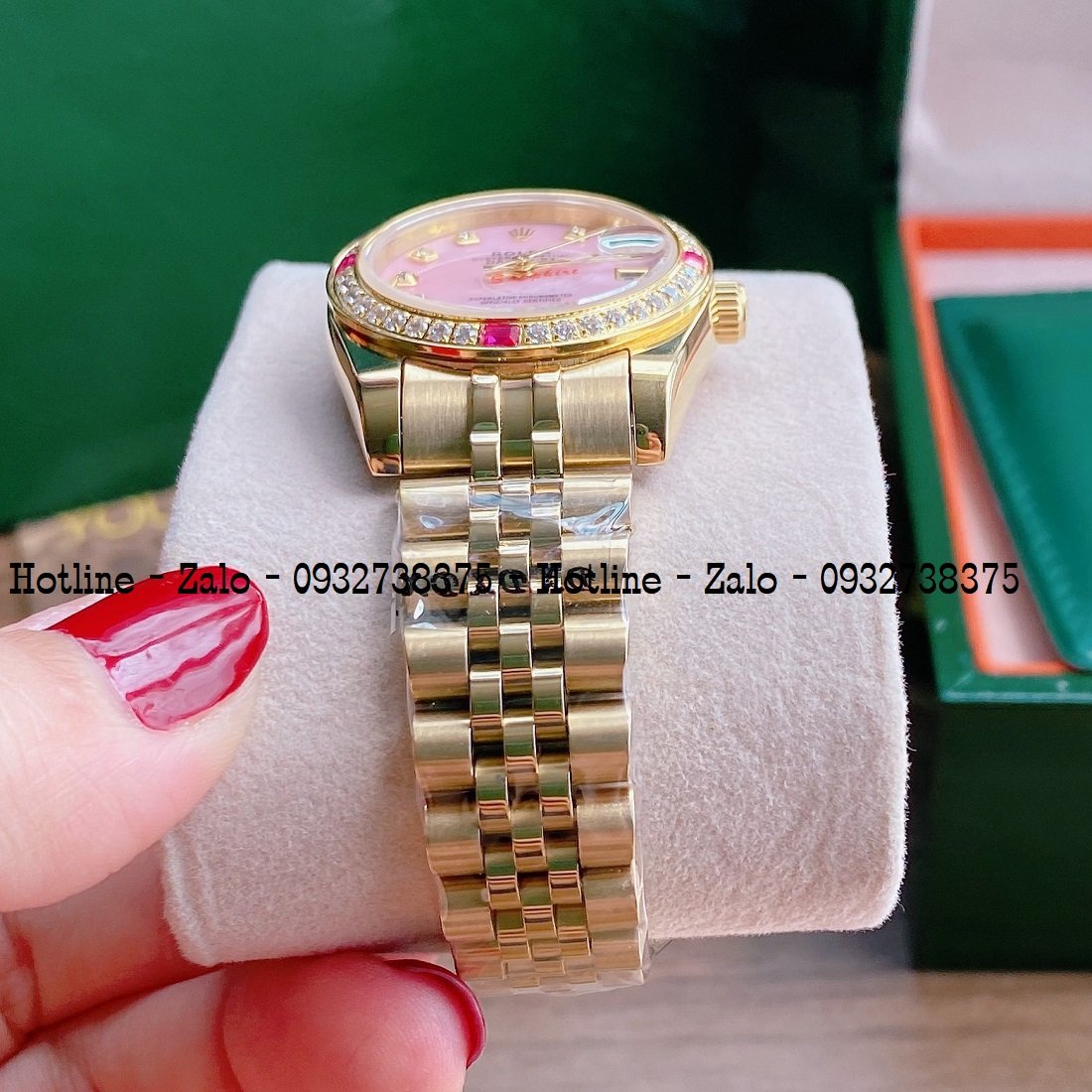 Đồng Hồ Nữ Rolex Viền Đá Dây Vàng Mặt Hồng Ngọc 32mm