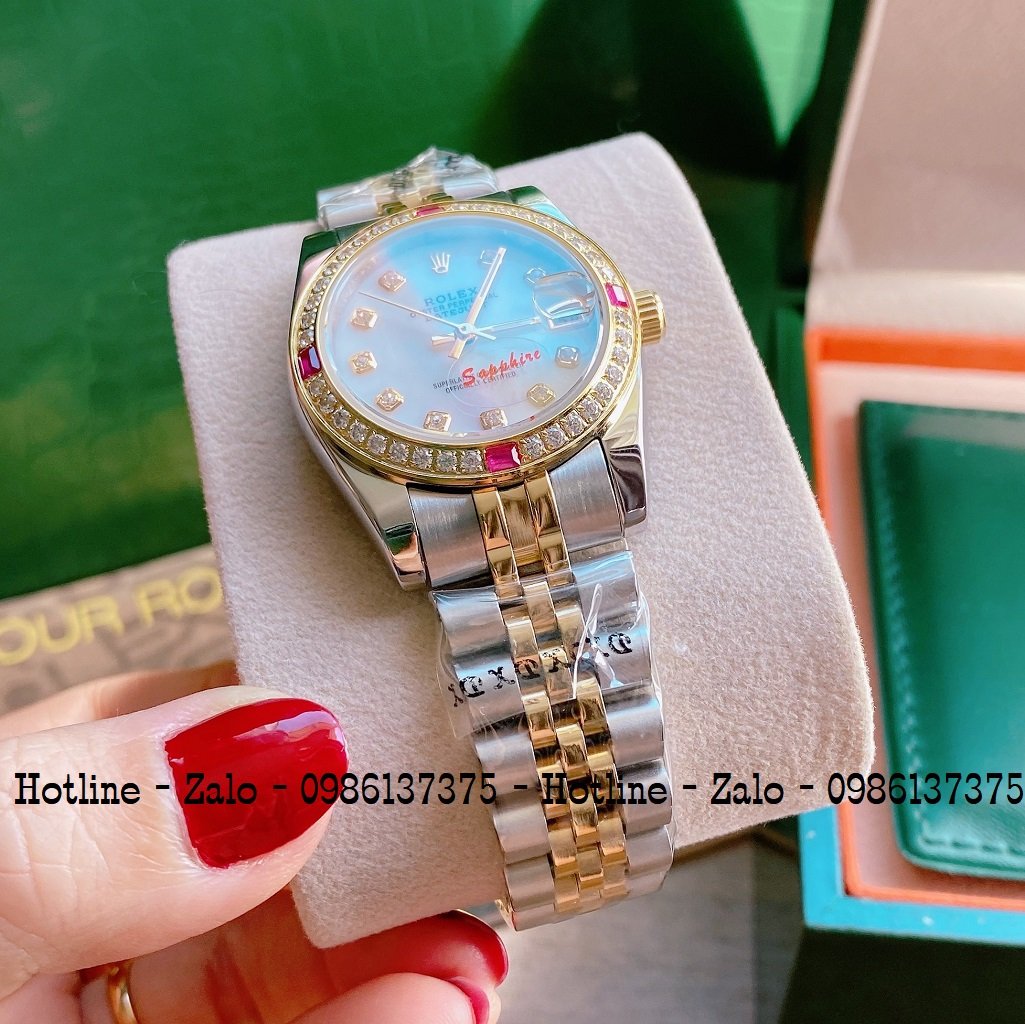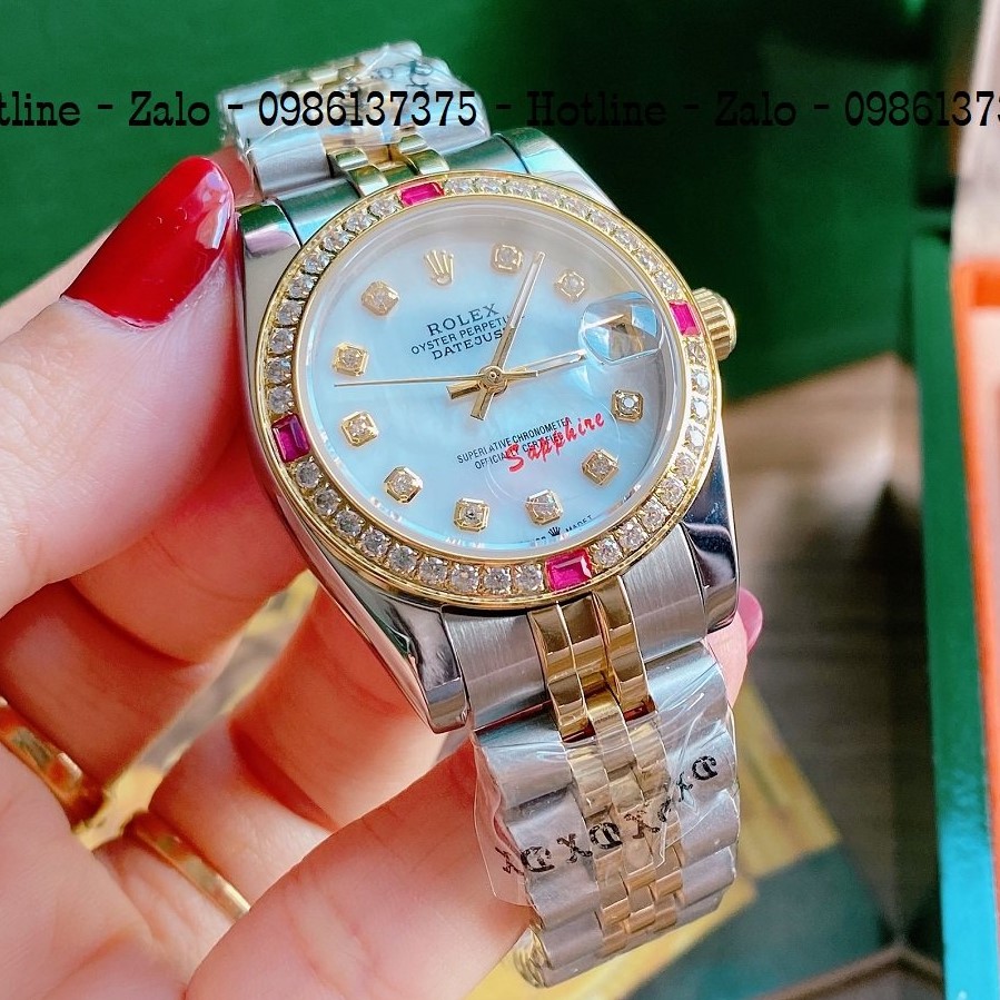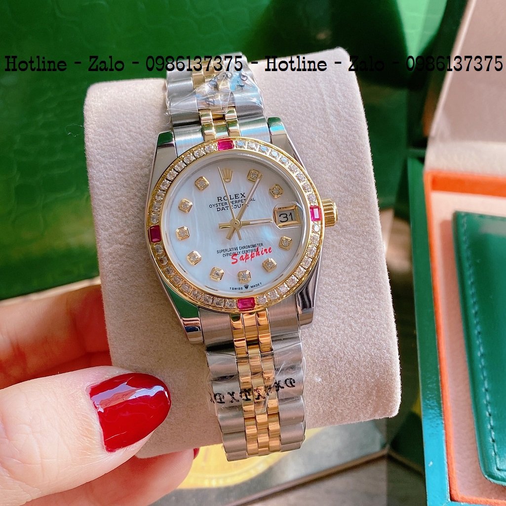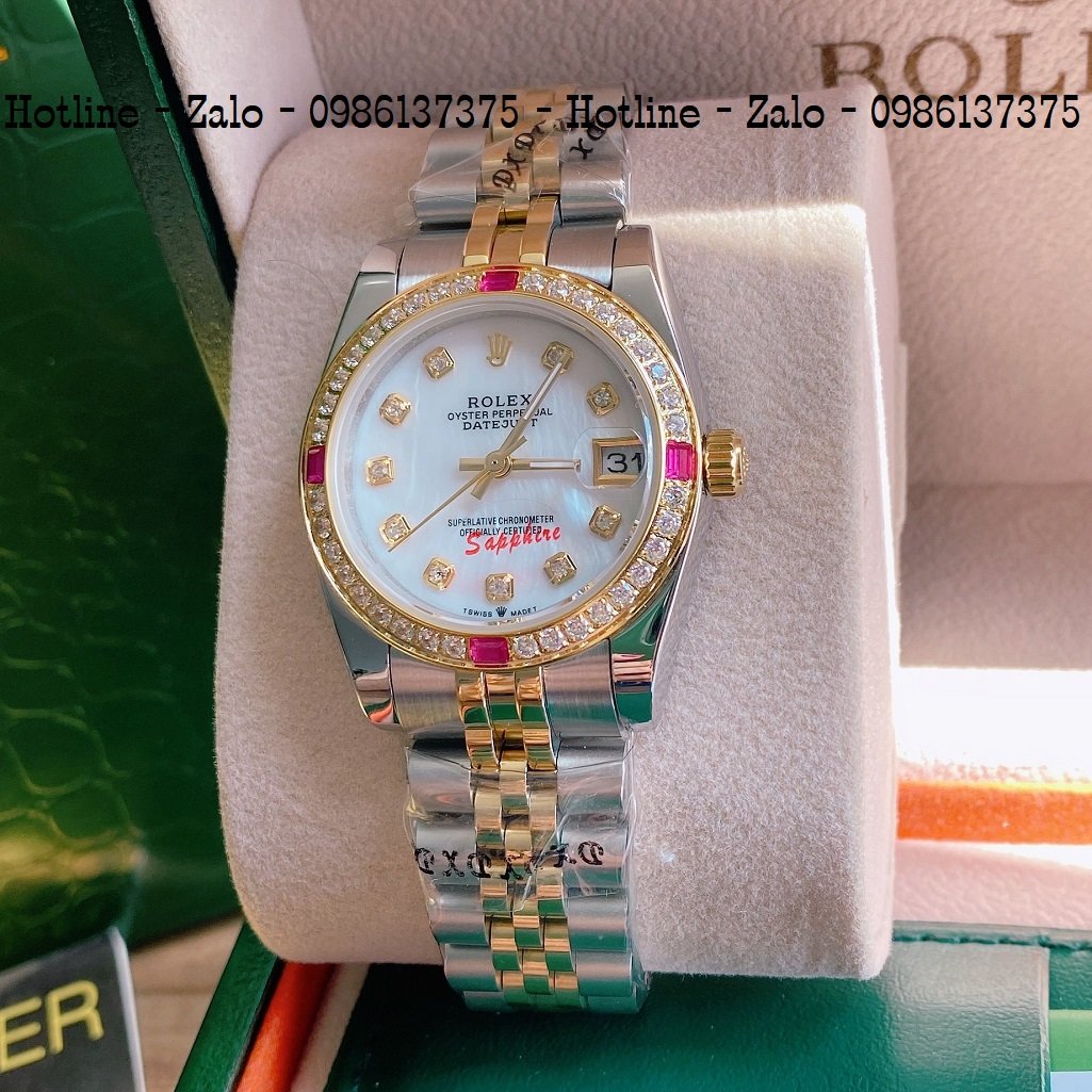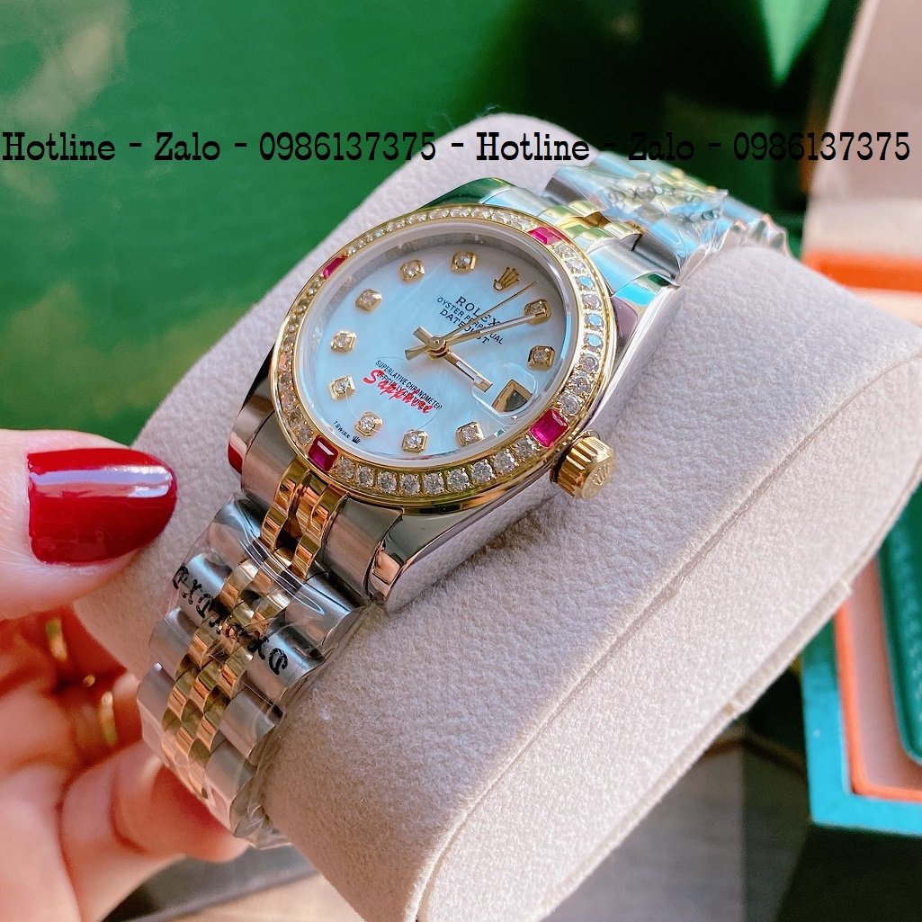 - Đồng Hồ Nữ Rolex Viền Đá Dây Vàng Mặt Trắng Ngọc 32mm