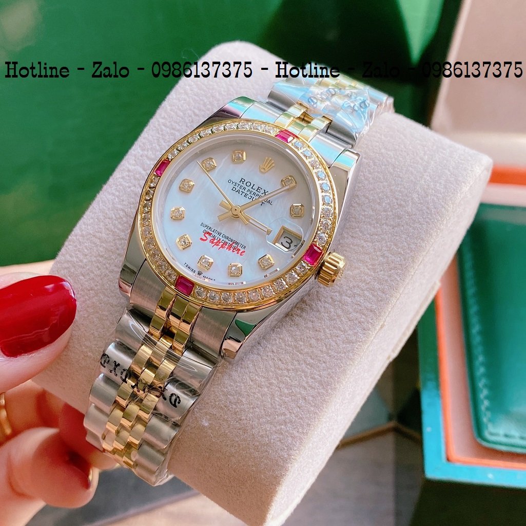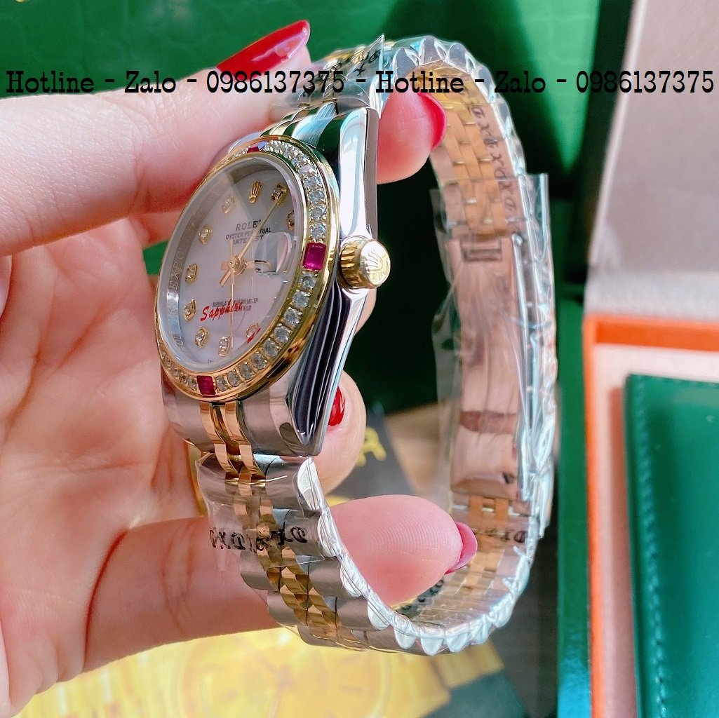Đồng Hồ Nữ Rolex Viền Đá Dây Vàng Mặt Trắng Ngọc 32mm