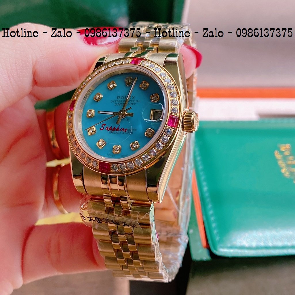 Đồng Hồ Nữ Rolex Viền Đá Dây Vàng Mặt Xanh Ngọc 32mm