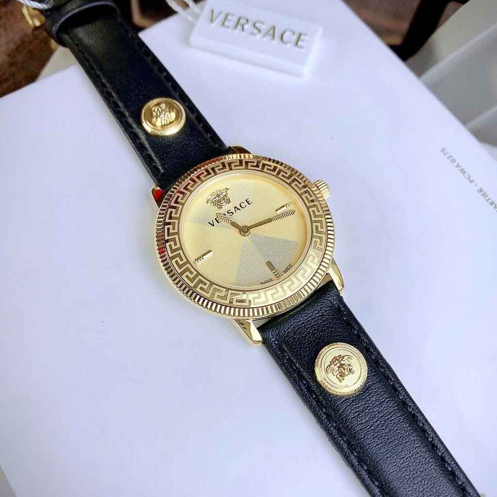Hình ảnh Đồng Hồ Nữ Versace Tribute Dây Da Đen Mặt Vàng Vỏ Vàng Gold Size 35mm - Quartz Japan
