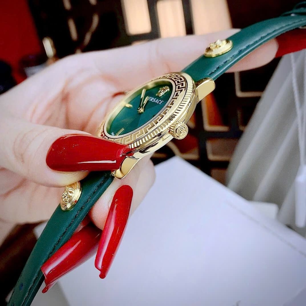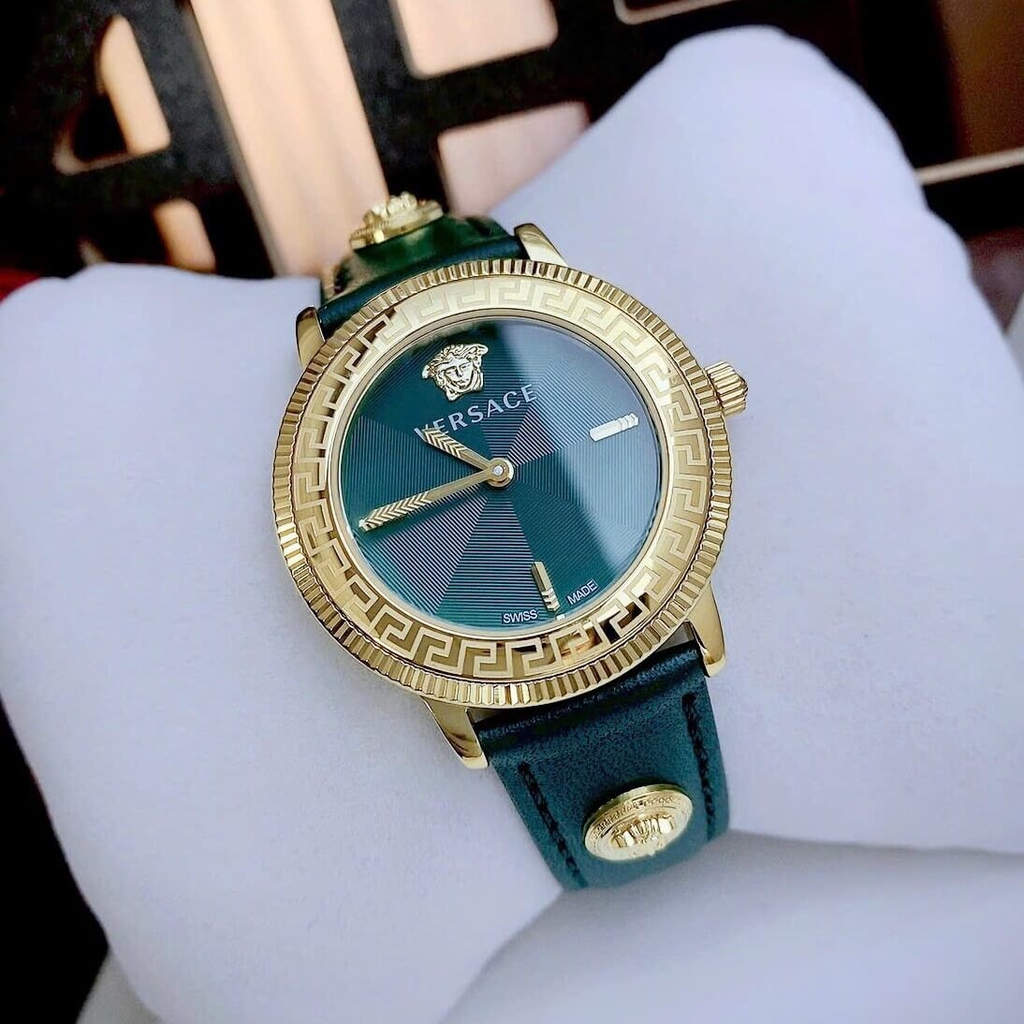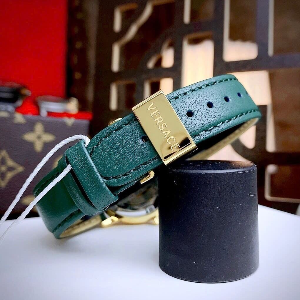 Hình ảnh Đồng Hồ Nữ Versace Tribute Dây Da Xanh Mặt Xanh Vỏ Vàng Gold Size 35mm - Quartz Japan