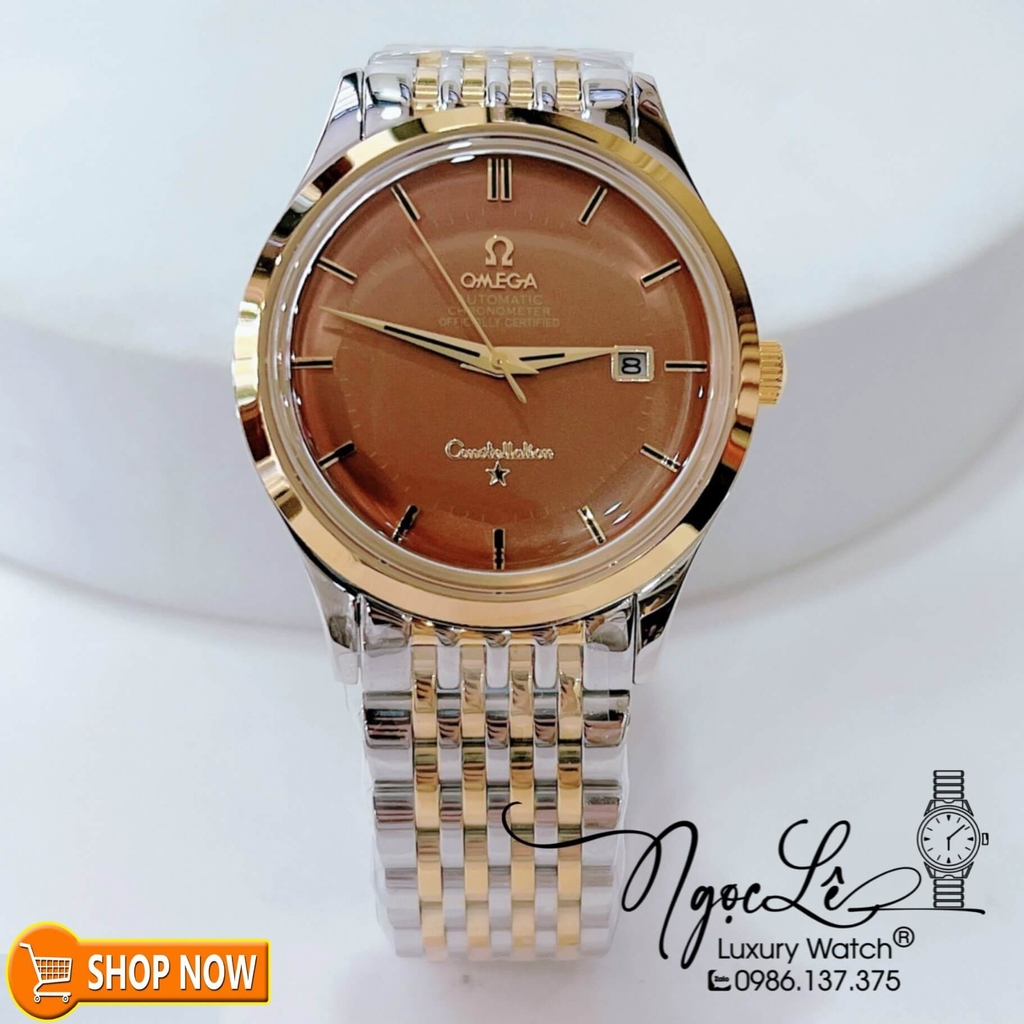 Đồng Hồ Omega Nam Máy Cơ Tự Động Dây Kim Loại Màu Demi Vàng Mặt Nâu Size 40mm