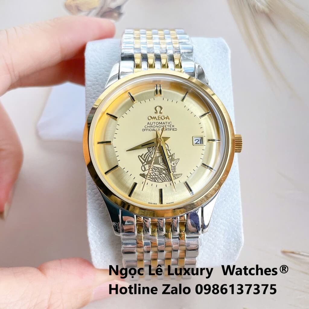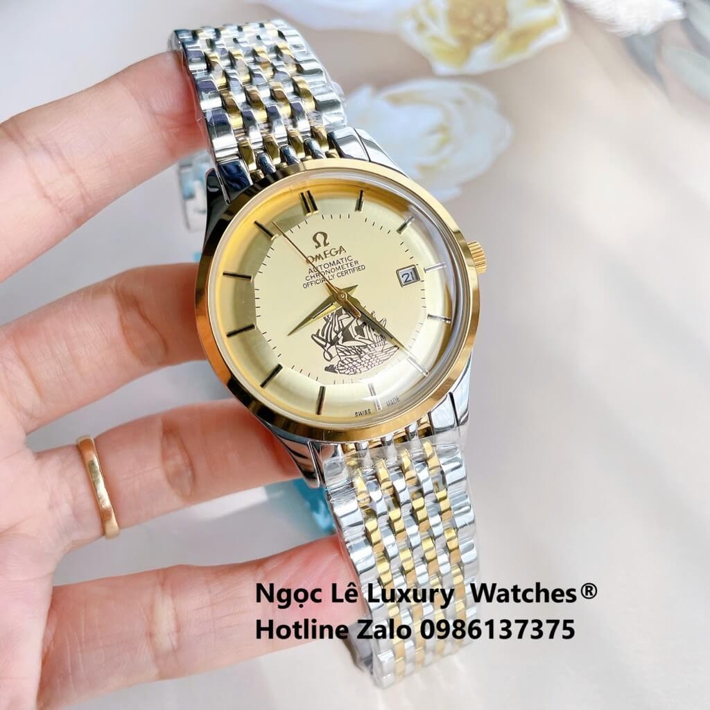 Hình ảnh Đồng Hồ Omega Nam Máy Cơ Tự Động Mặt Thuyền Buồm Dây Demi Vàng Mặt Vàng Size 40mm