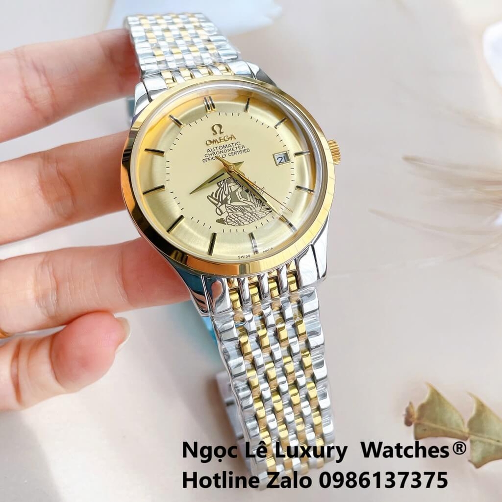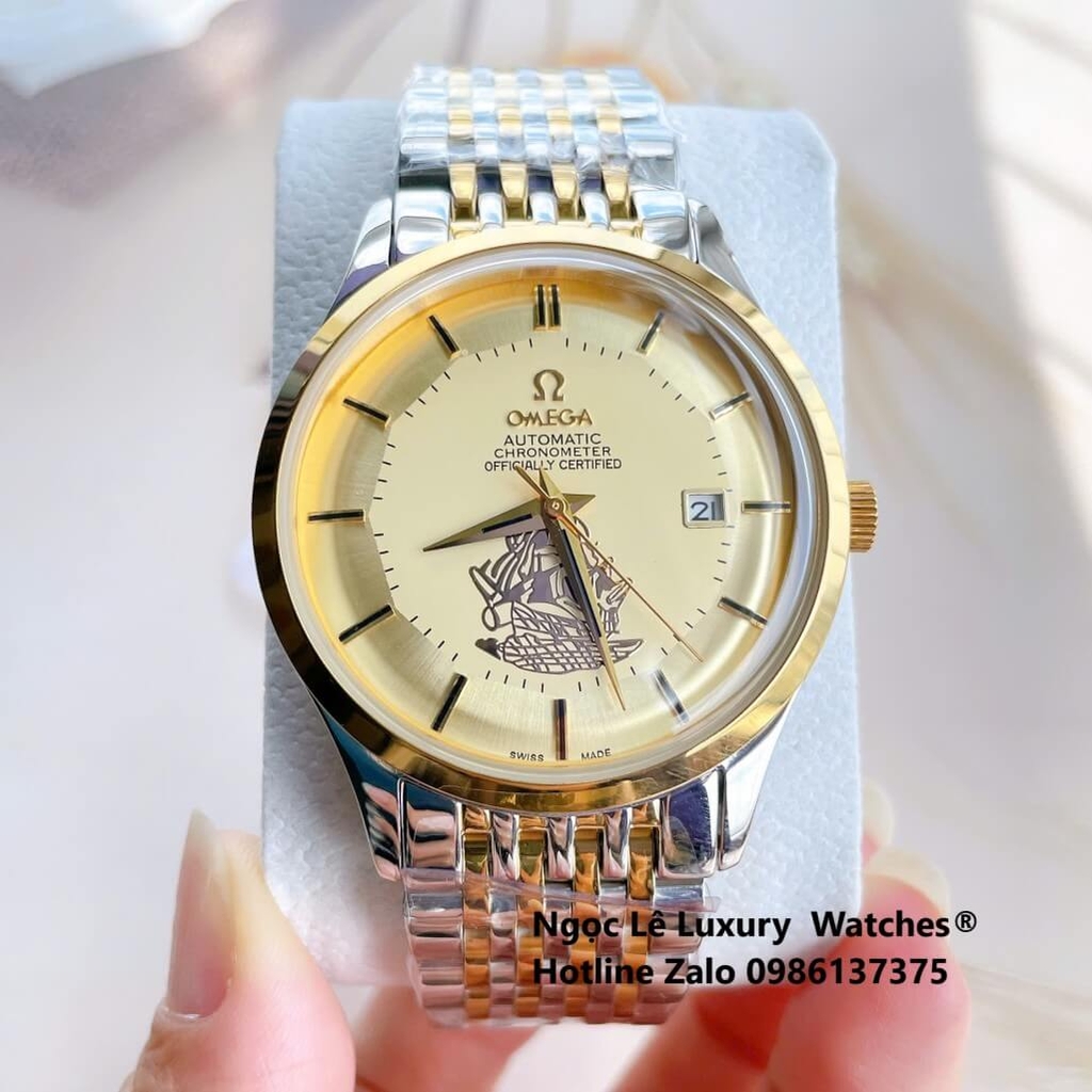 Đồng Hồ Omega Nam Máy Cơ Tự Động Mặt Thuyền Buồm Dây Demi Vàng Mặt Vàng Size 40mm