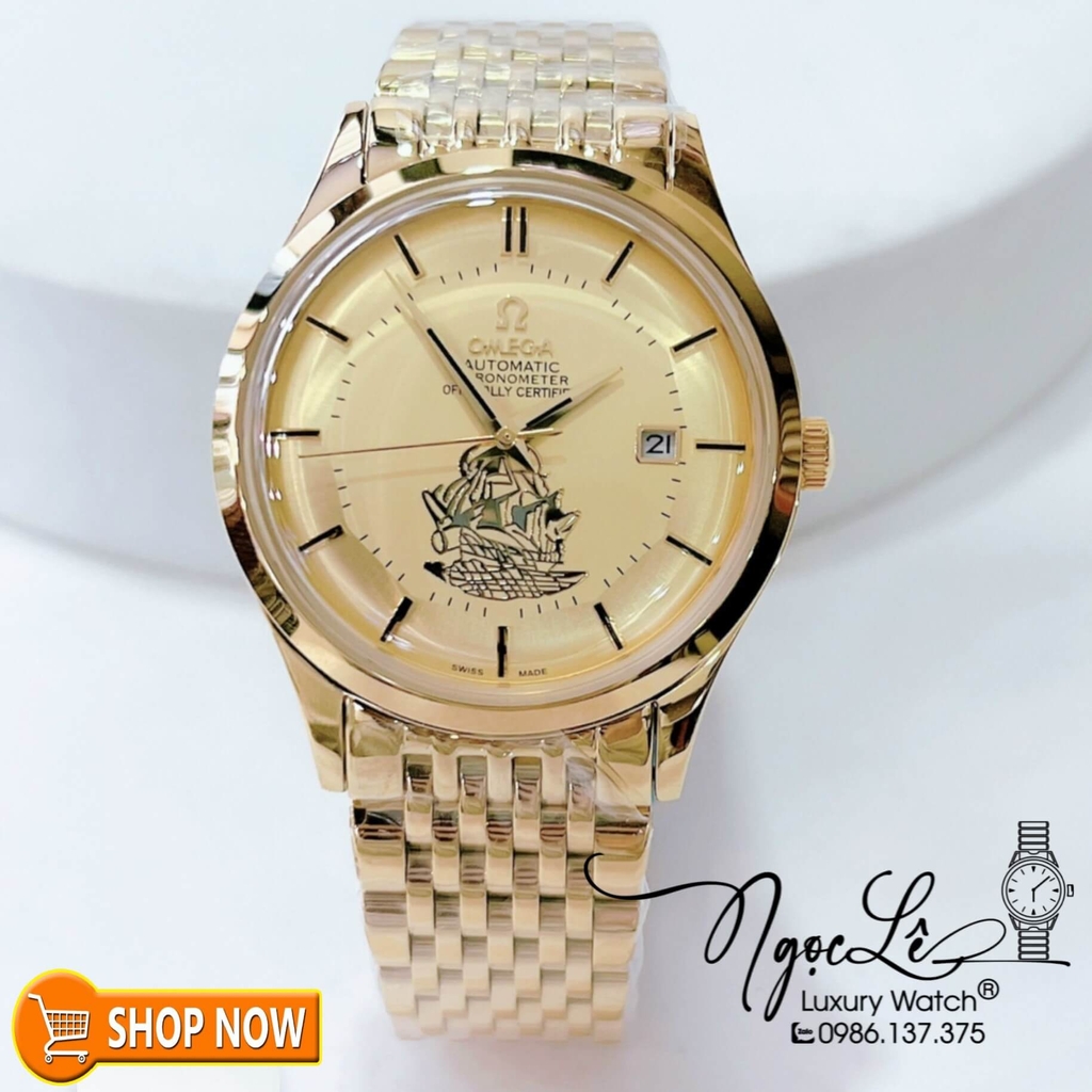 Đồng Hồ Omega Nam Máy Cơ Tự Động Mặt Thuyền Buồm Dây Kim Loại Màu Vàng Size 40mm