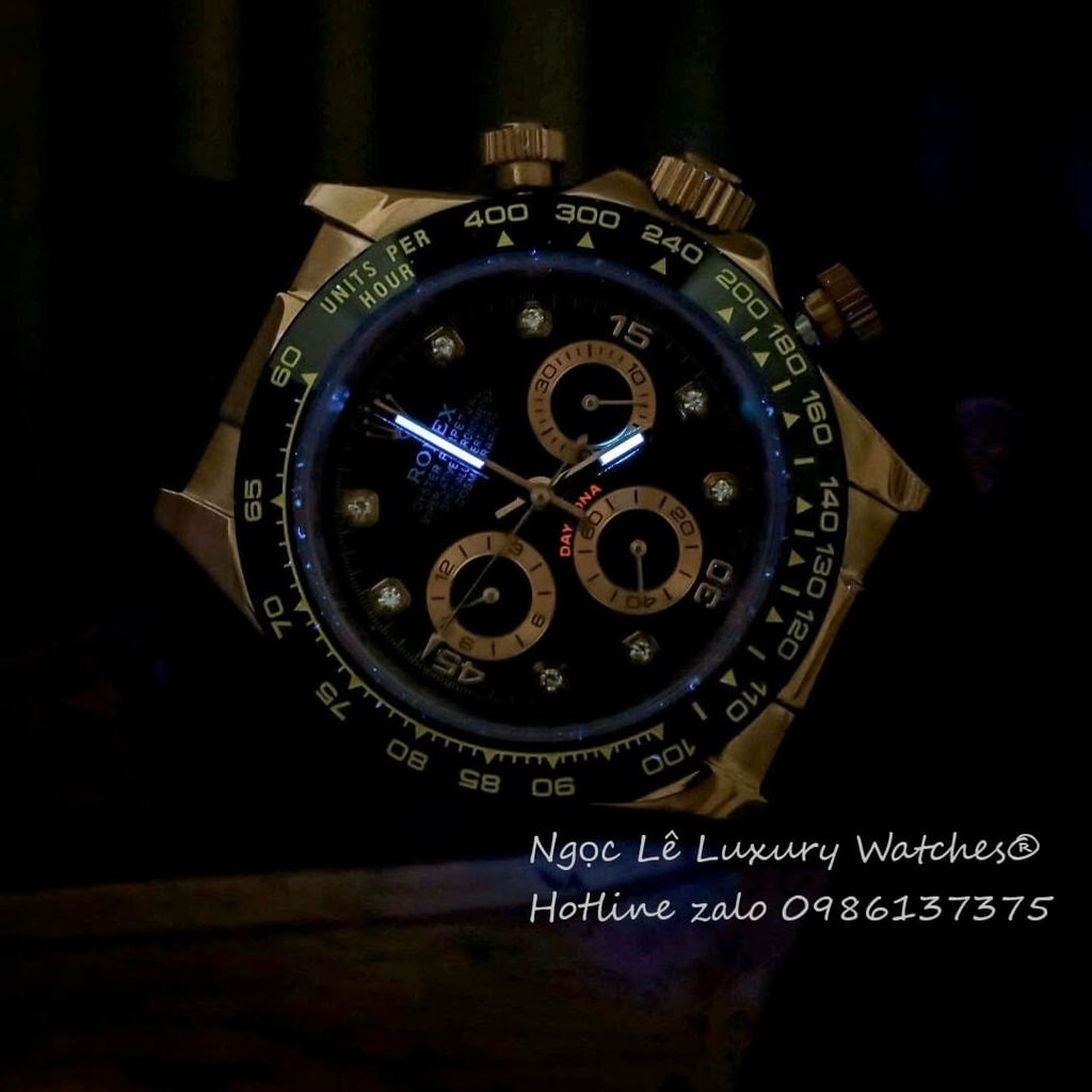 - Đồng hồ Rolex Daytona tự động cho nam, quanh mặt đồng hồ niềng đá sapphire chống trầy, bên trong mặt được đính vạch phản quang dễ xem giờ