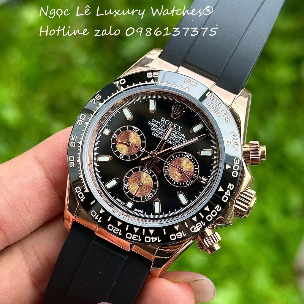Đồng Hồ Rolex Cosmograph Daytona Automatic Dây Cao Su Đen Mặt Đen Vỏ Rose Size 40mm