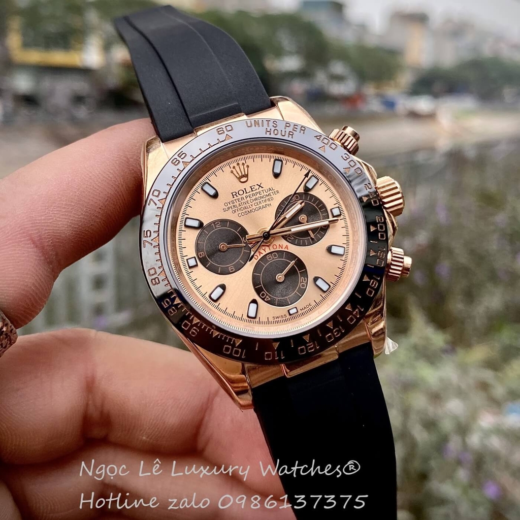 Đồng hồ Rolex Daytona dây cao su đen mặt vàng hồng size 40mm, mẫu đồng hồ Rolex thể thao trẻ trung cho anh em