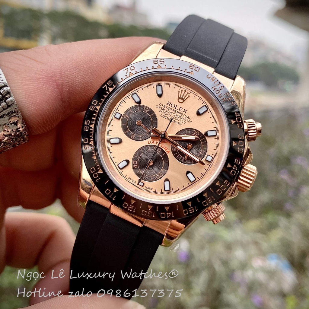 Đồng Hồ Rolex Cosmograph Daytona Automatic Dây Cao Su Đen Mặt Vàng Hồng Size 40mm