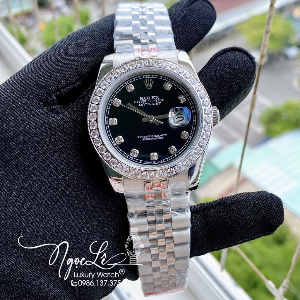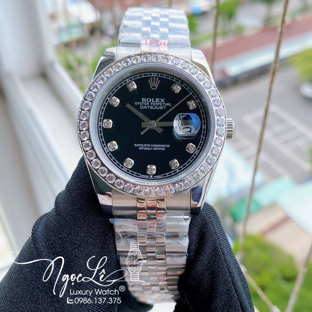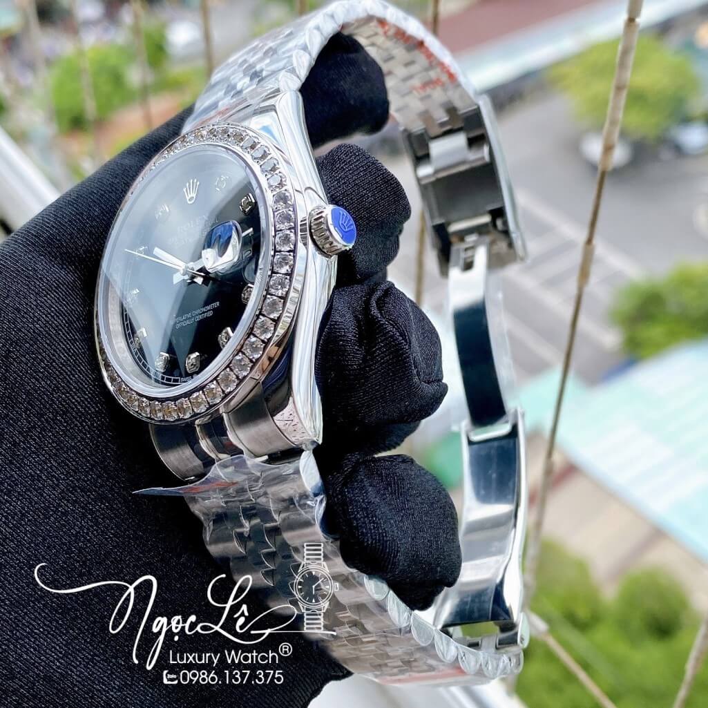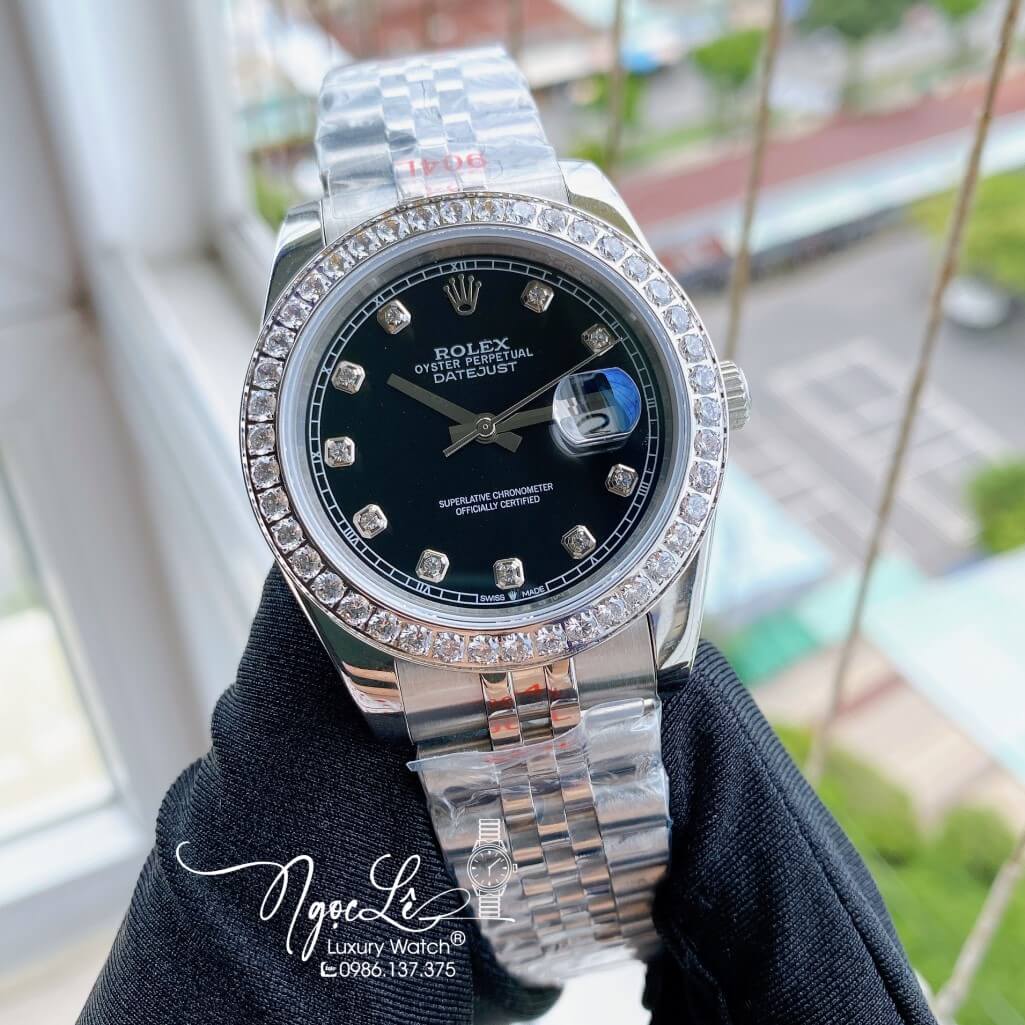Đồng Hồ Rolex Datejust Nam Automatic Dây Thép Màu Bạc Mặt Đen Viền Đá 41mm
