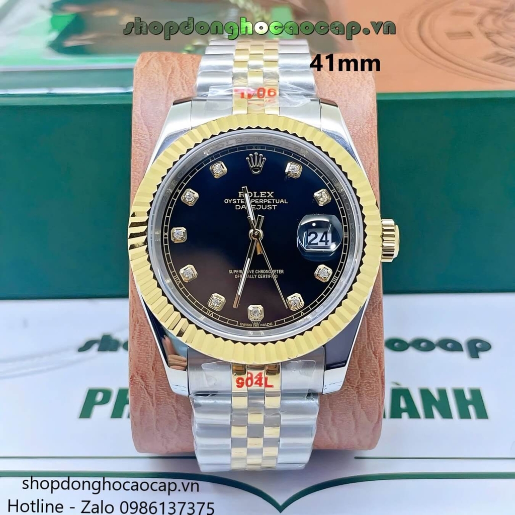 Đồng Hồ Rolex Datejust Nam Máy Pin Dây Kim Loại Demi Vàng Mặt Đen Size 41mm