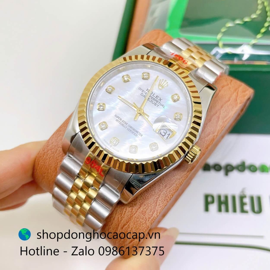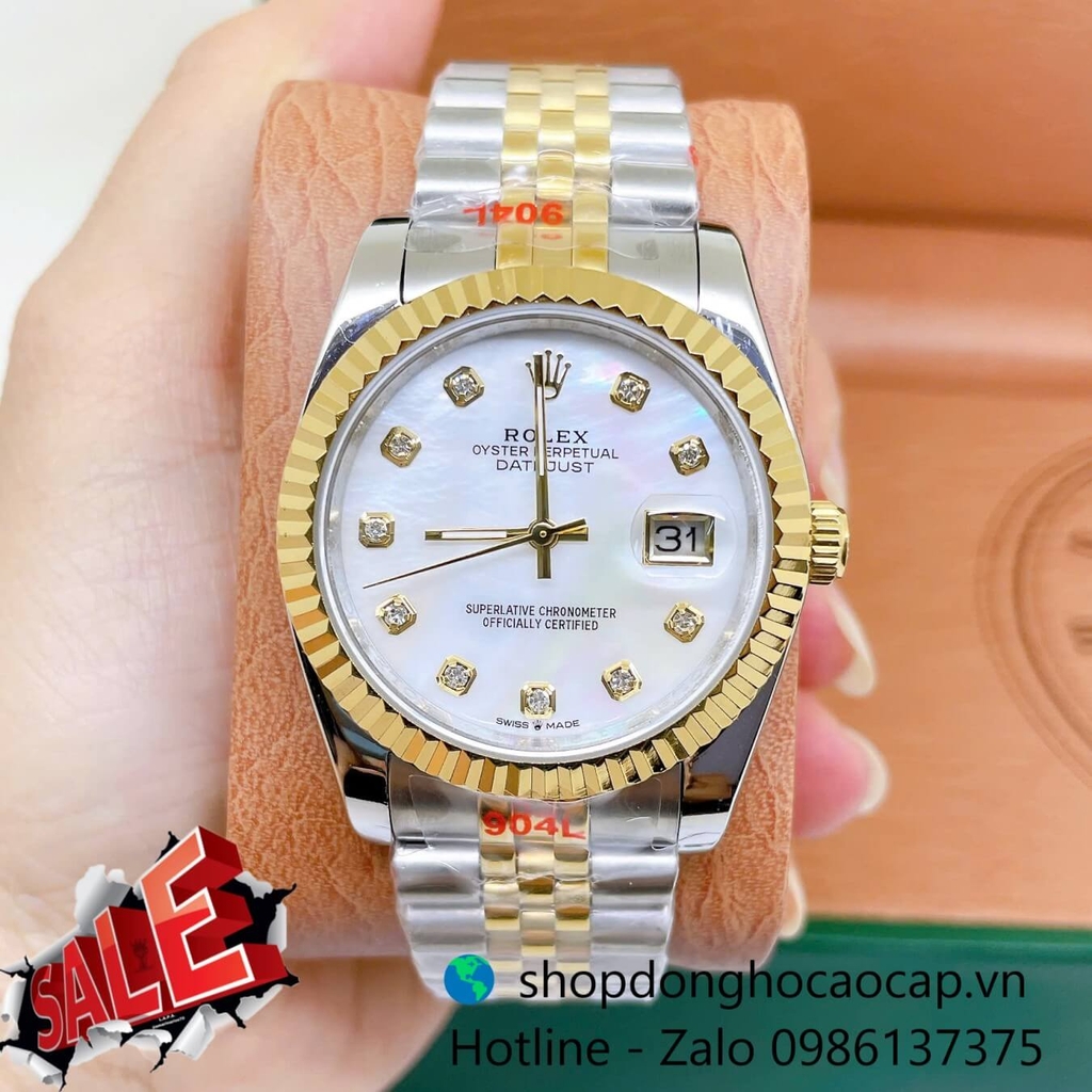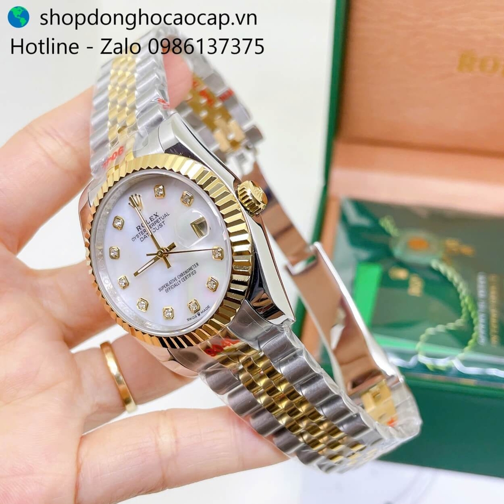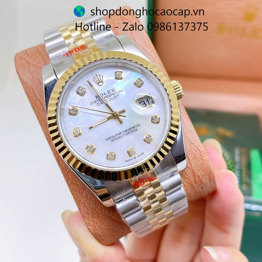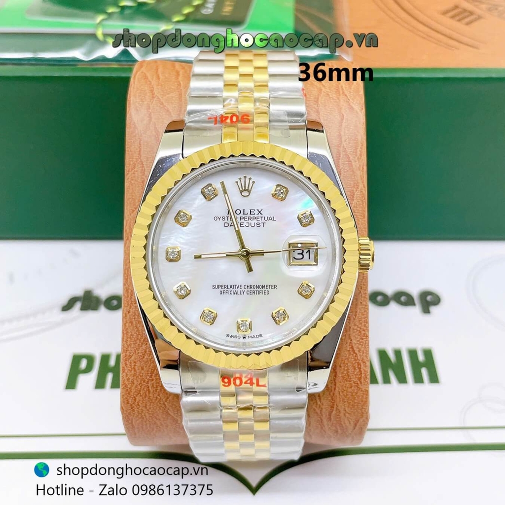 Đồng Hồ Rolex Datejust Nam Máy Pin Dây Kim Loại Demi Vàng Mặt Trắng Xà Cừ Size 36mm