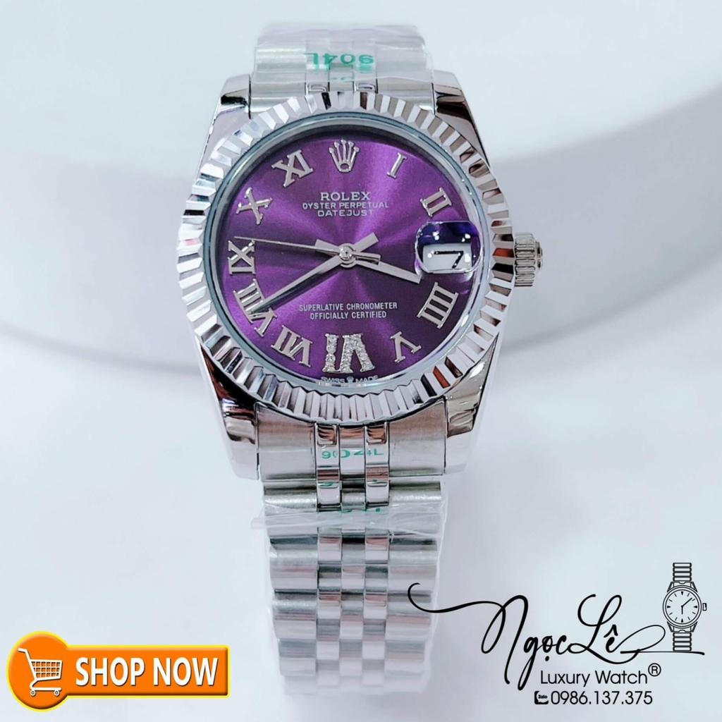 - Đồng Hồ Rolex Datejust Nữ Máy Cơ Tự Động Bạc Mặt Tím Số La Mã Size 31mm