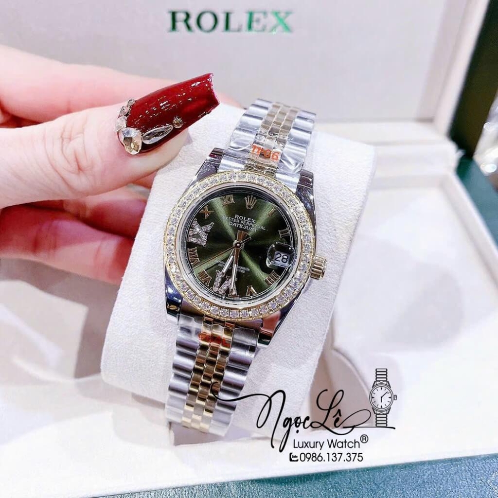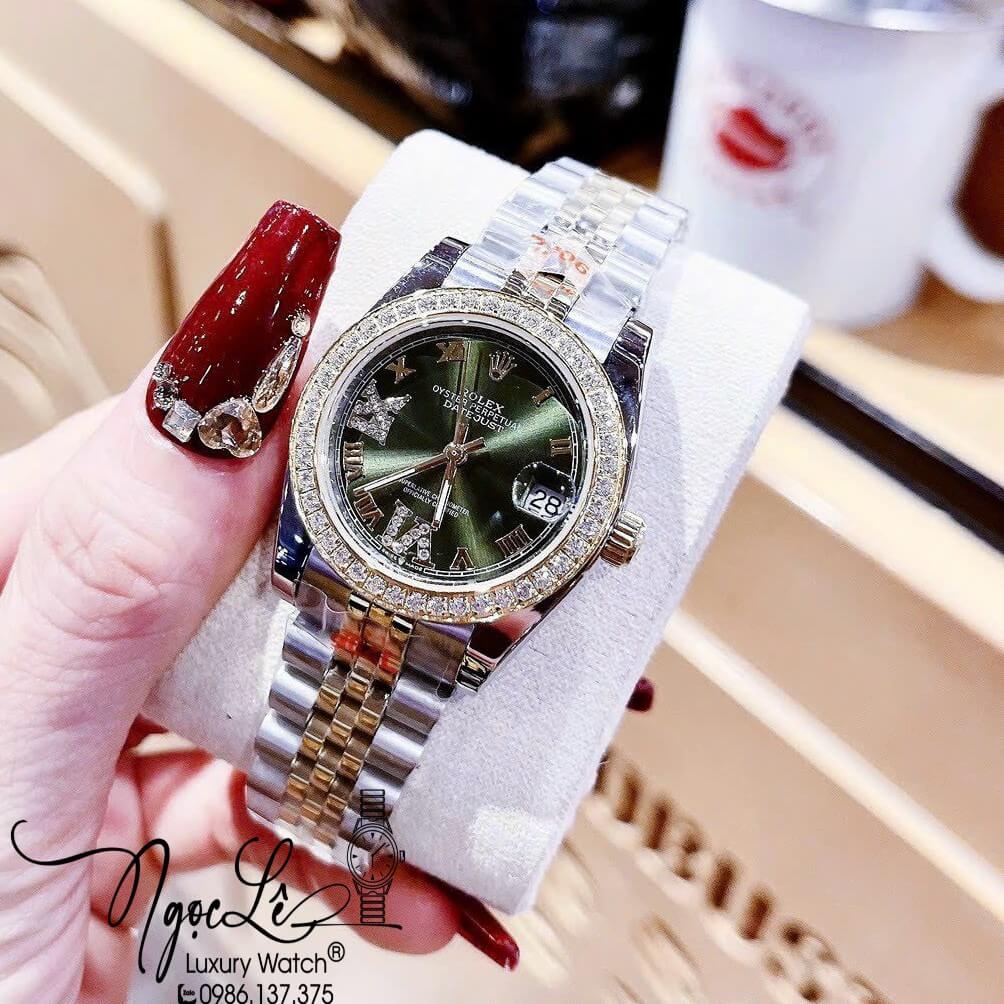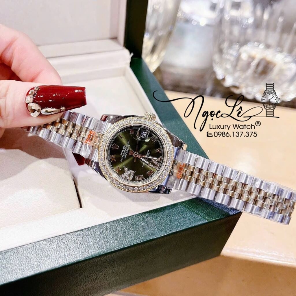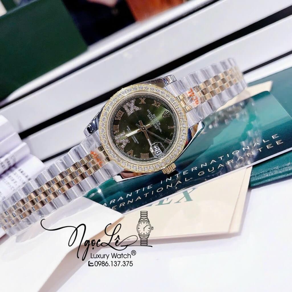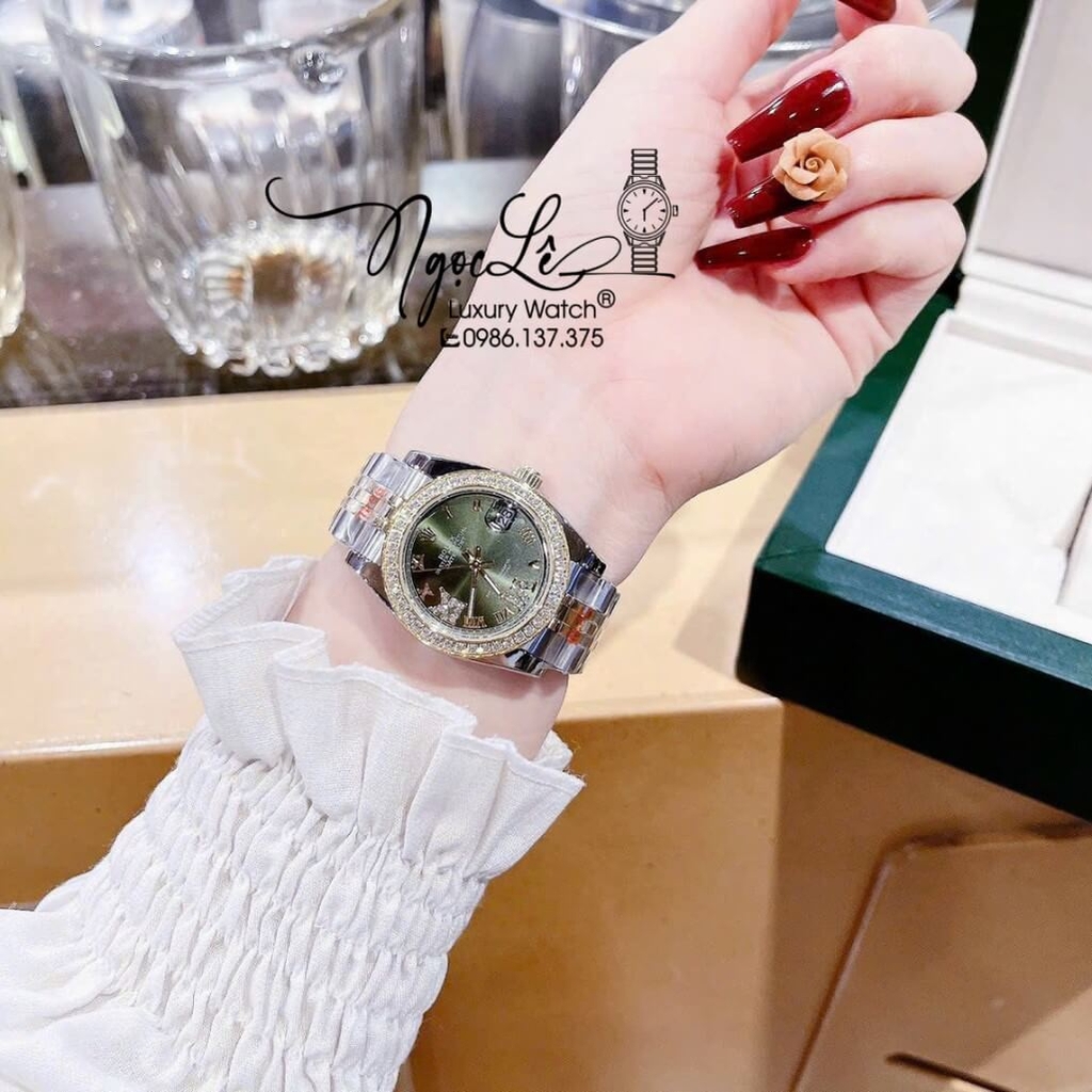 - Đồng hồ Rolex Datejust - Rolex đính đá máy pin mặt xanh rêu số la mã dành cho nữ cao cấp