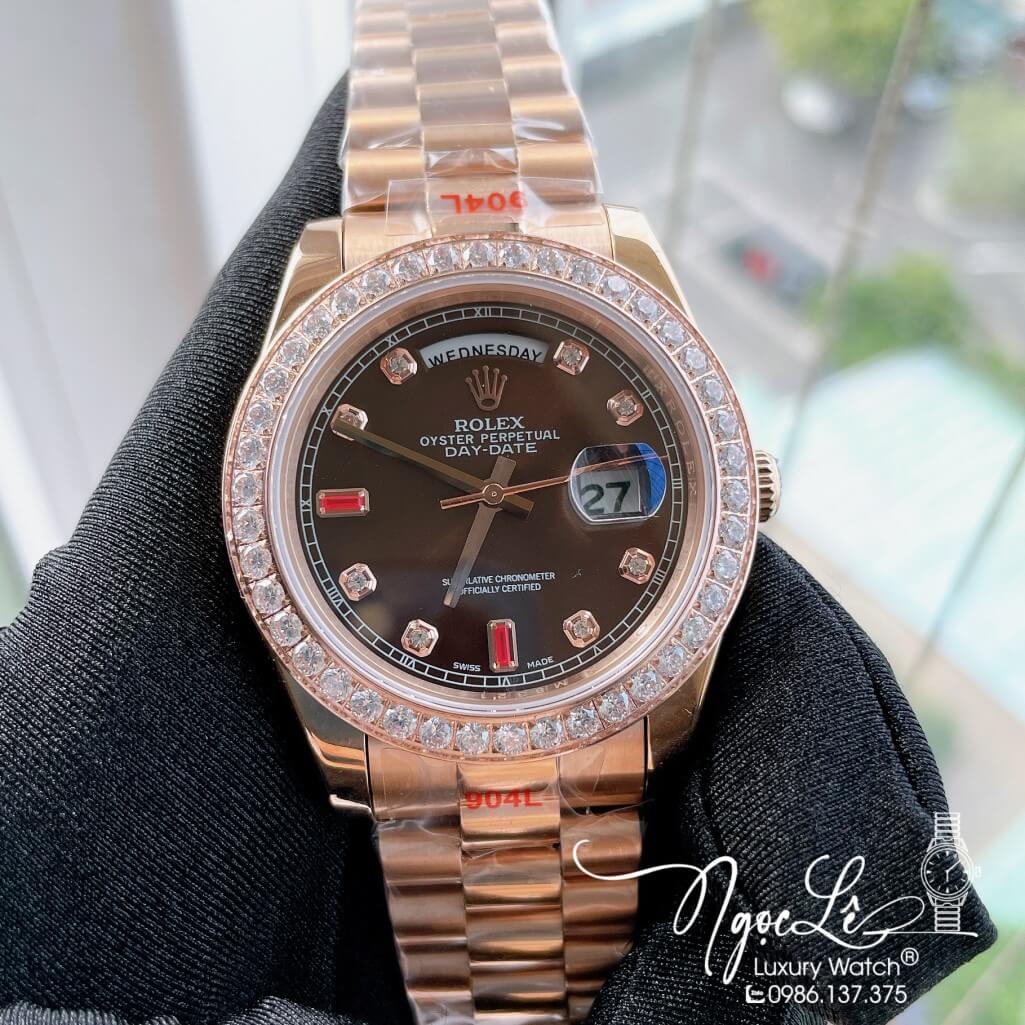 Đồng Hồ Rolex Day-Date Automatic Dây Kim Loại Vàng Hồng Mặt Nâu Đính Đá 41mm