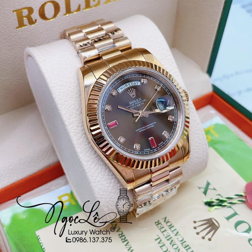 Đồng Hồ Rolex Day-Date Automatic Nam Dây Kim Loại Vàng Hồng Mặt Nâu 41mm