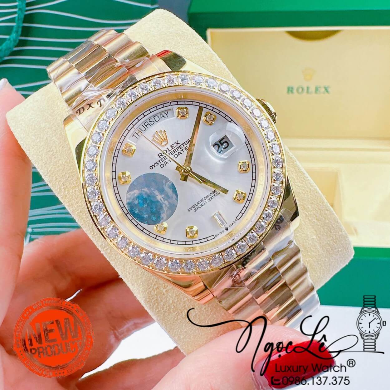 Đồng Hồ Rolex Day-Date Automatic Nam Dây Kim Loại Vàng Mặt Trắng Niềng Đá Size 41mm