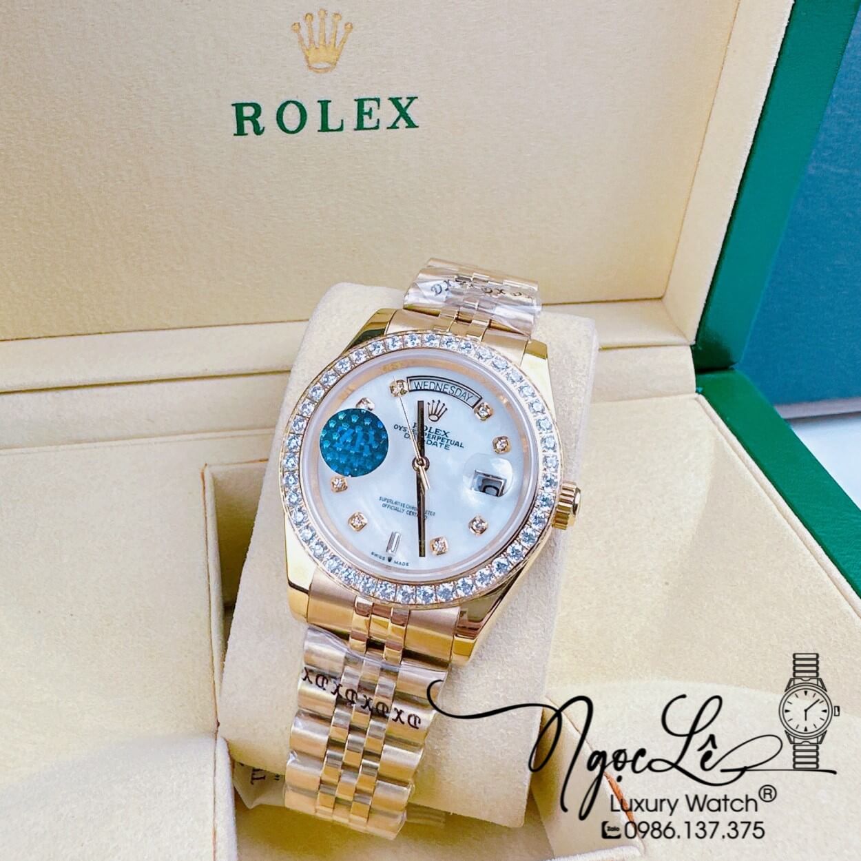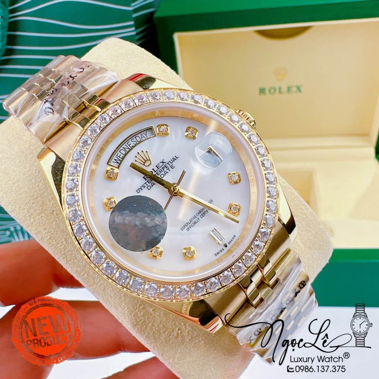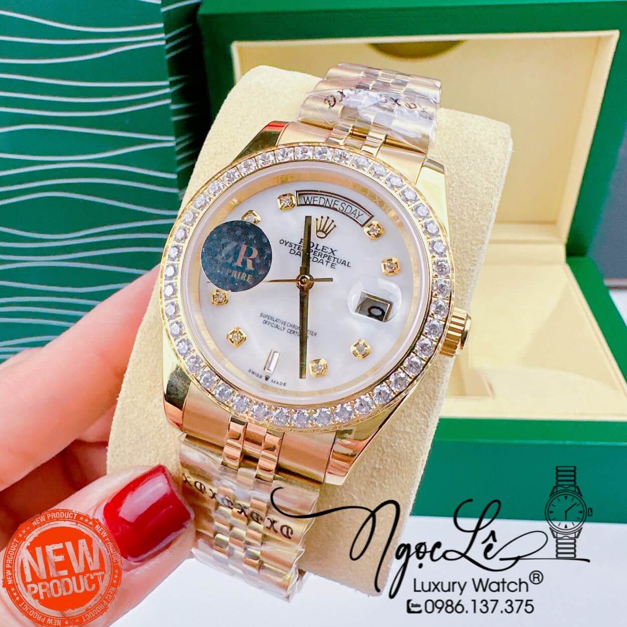 Đồng Hồ Rolex Day-Date Automatic Nam Dây Kim Loại Vàng Mặt Xà Cừ Niềng Đá Size 41mm