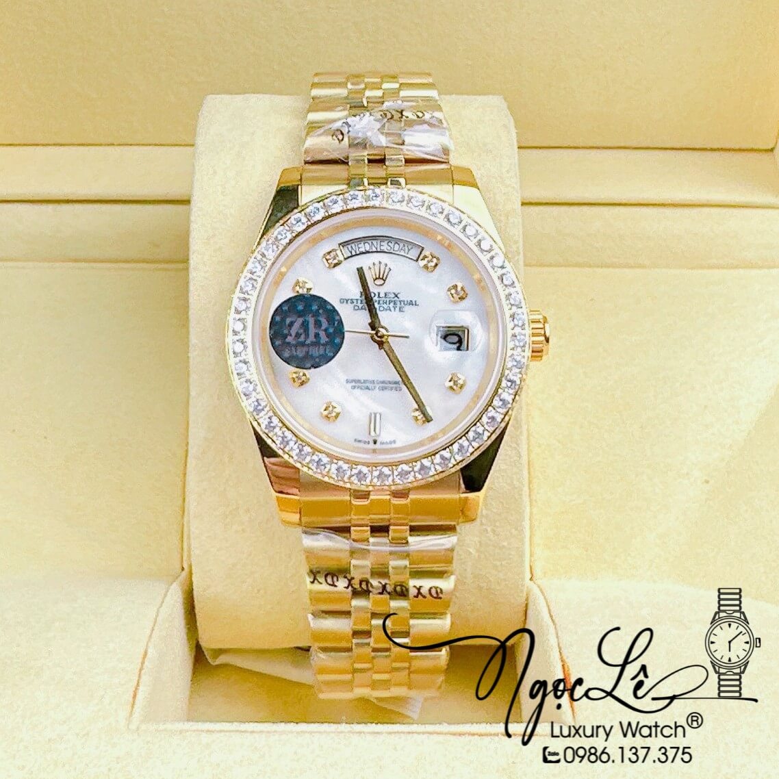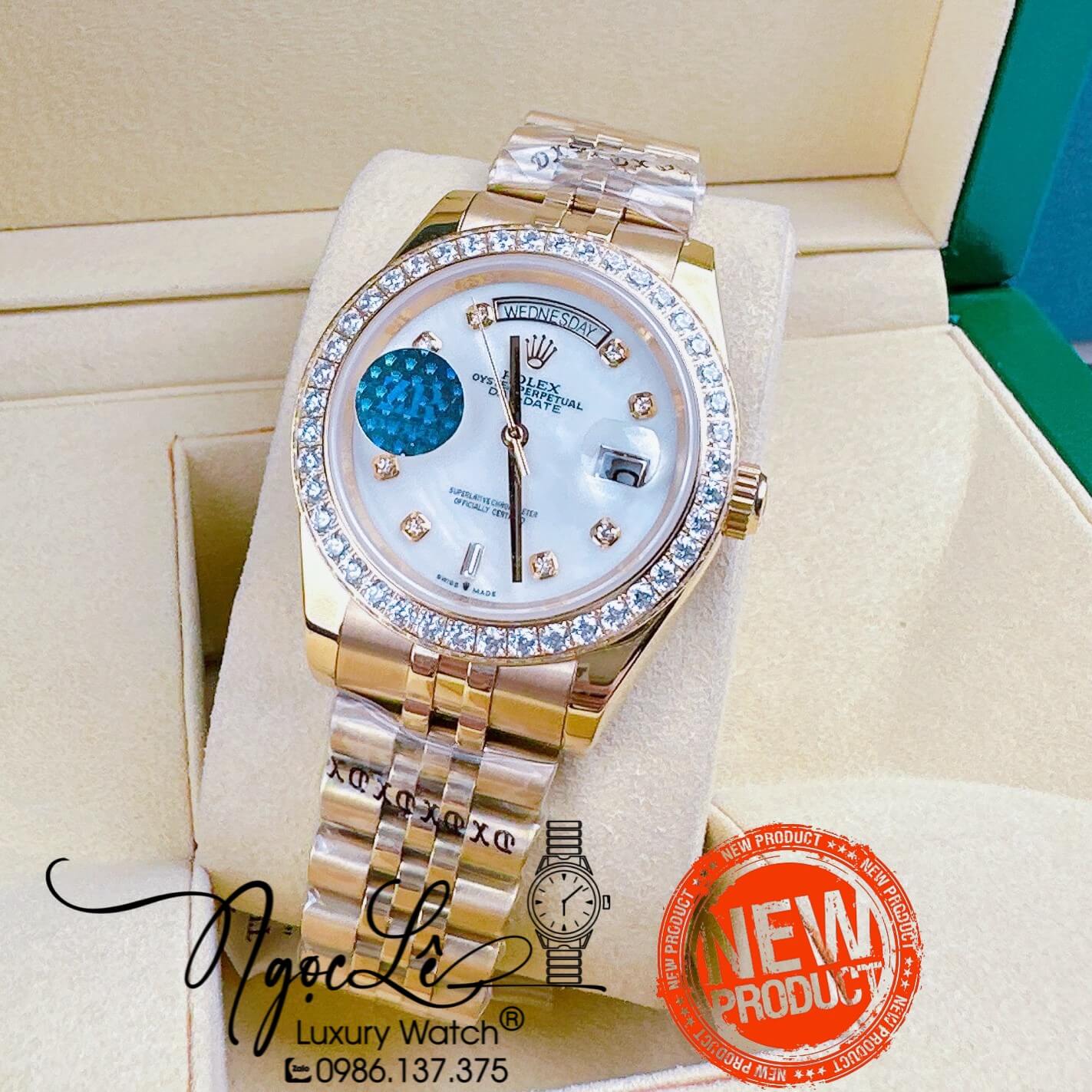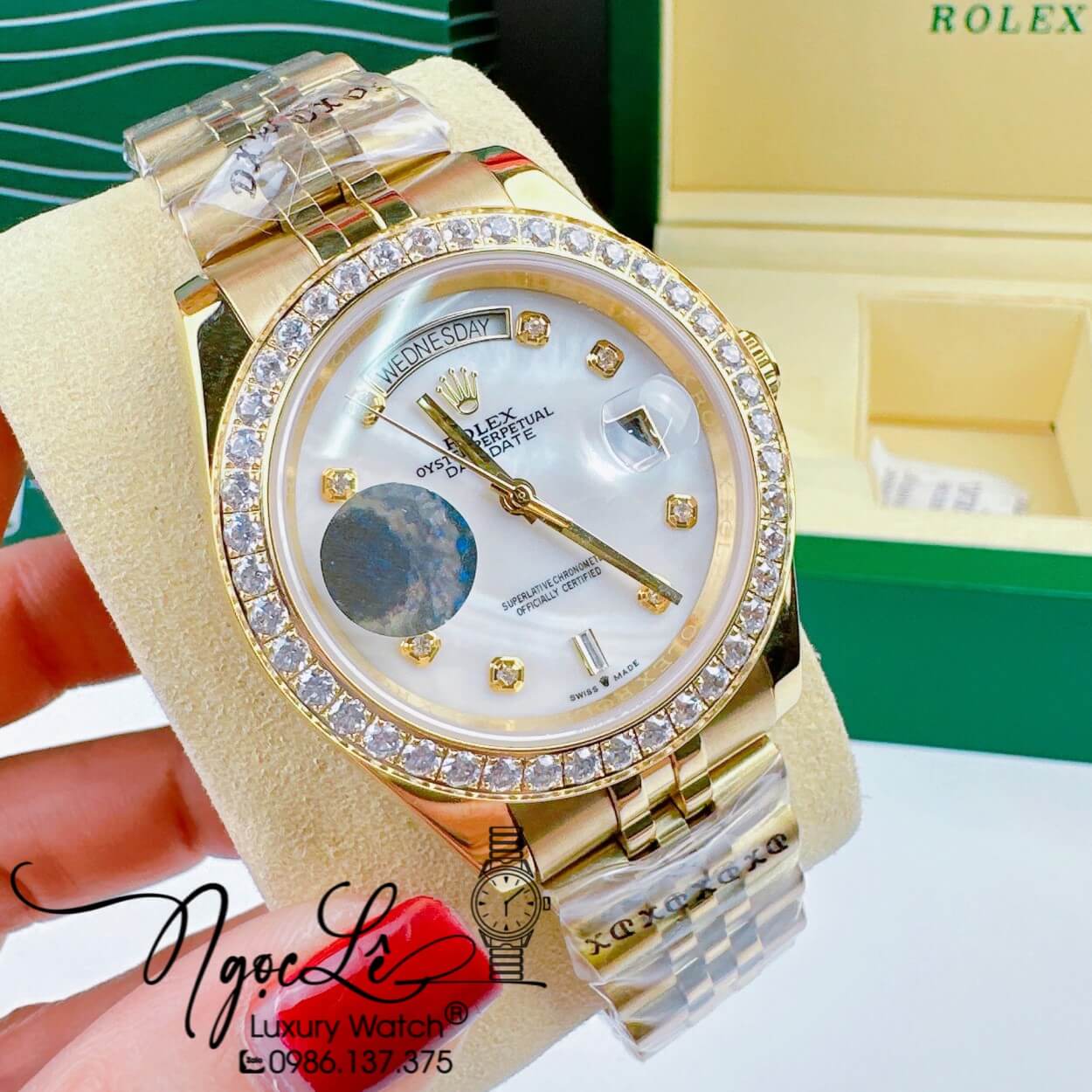 Đồng Hồ Rolex Day-Date Automatic Nam Dây Kim Loại Vàng Mặt Xà Cừ Niềng Đá Size 41mm