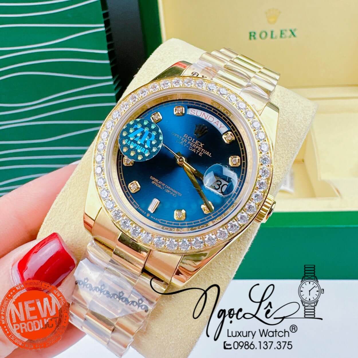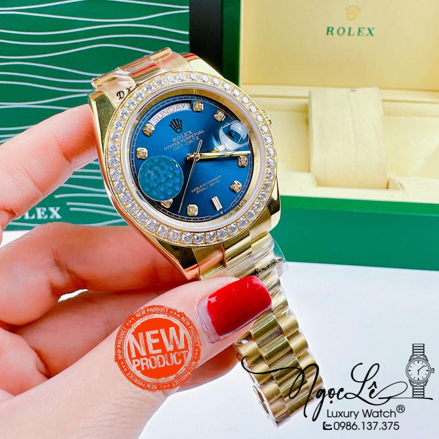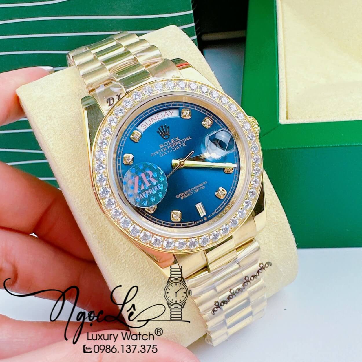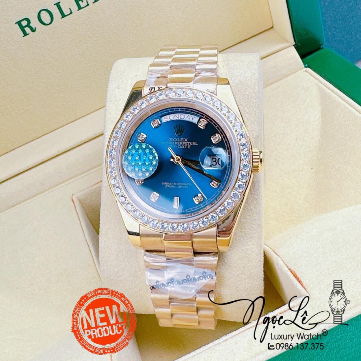 Đồng Hồ Rolex Day-Date Automatic Nam Dây Kim Loại Vàng Mặt Xanh Dương Niềng Đá Size 41mm