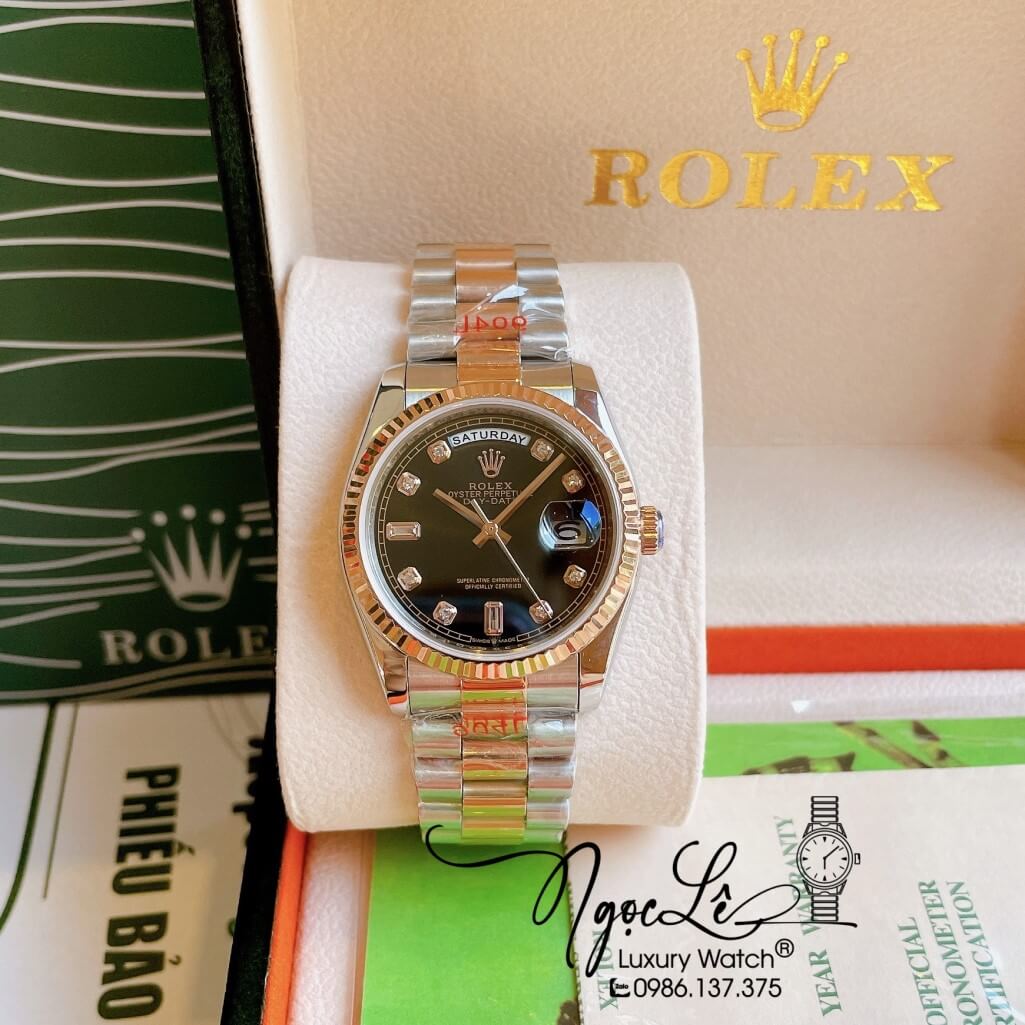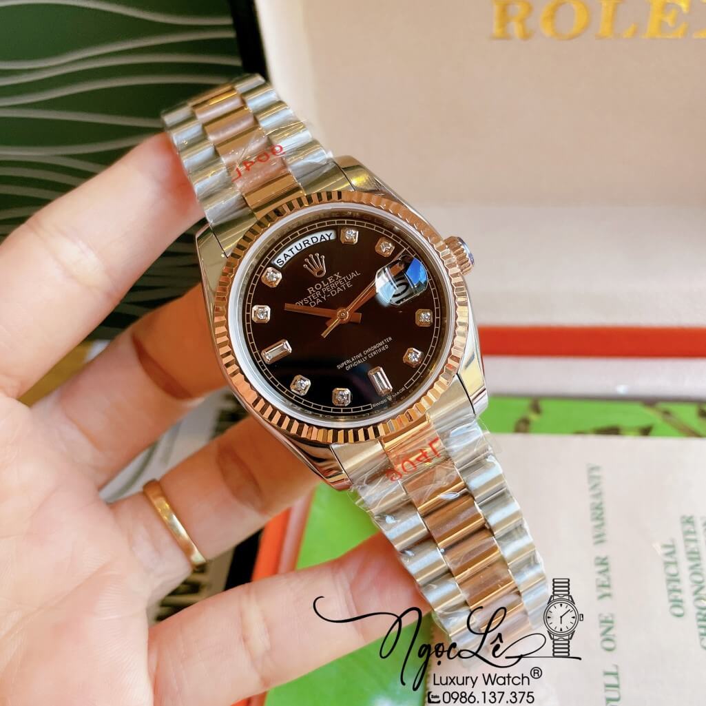 Đồng Hồ Rolex Day-Date Automatic Unisex Dây Kim Loại Demi Rose Mặt Đen 36mm