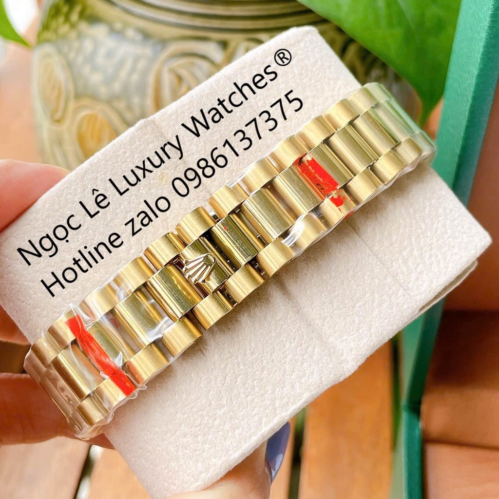 Mẫu Rolex Day-Date 41mm gây ấn tượng với tone vàng đồng bộ từ dây, vỏ đến mặt số, tạo nên tổng thể hài hòa và sang trọng.