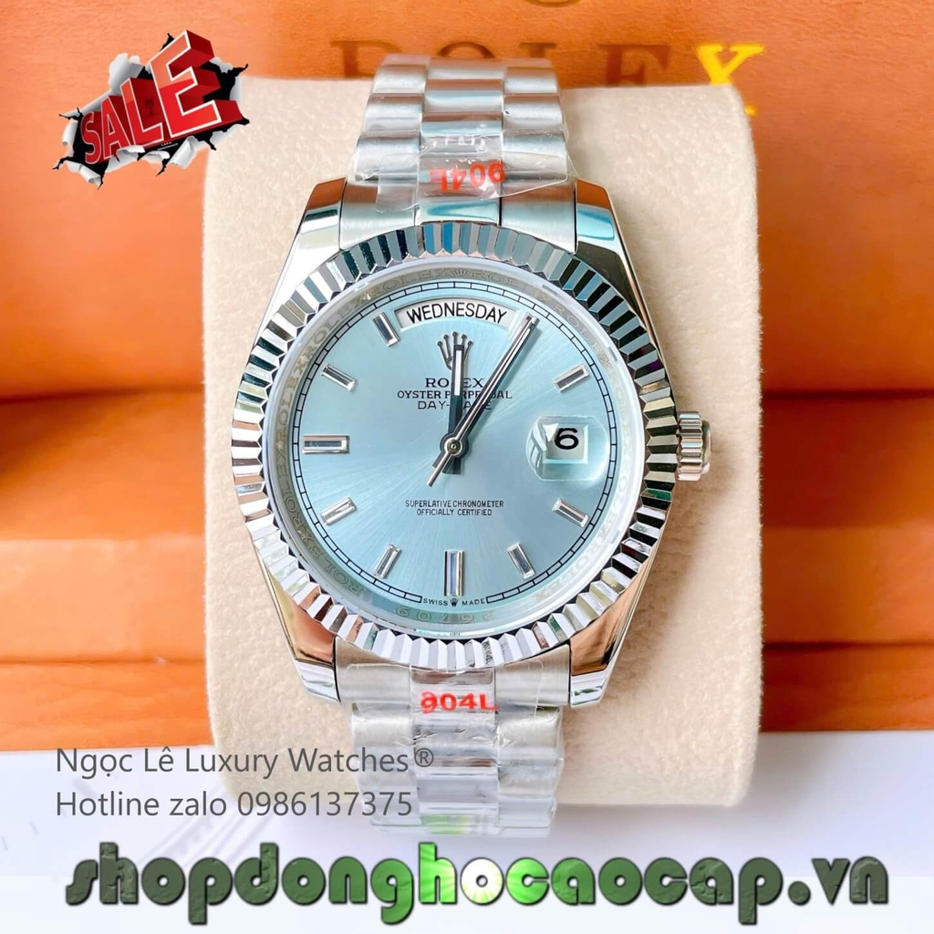 Đồng Hồ Rolex Day-Date Tự Động Dây Thép Màu Bạc Mặt Xanh Nhạt Size 41mm - Niềng Khía