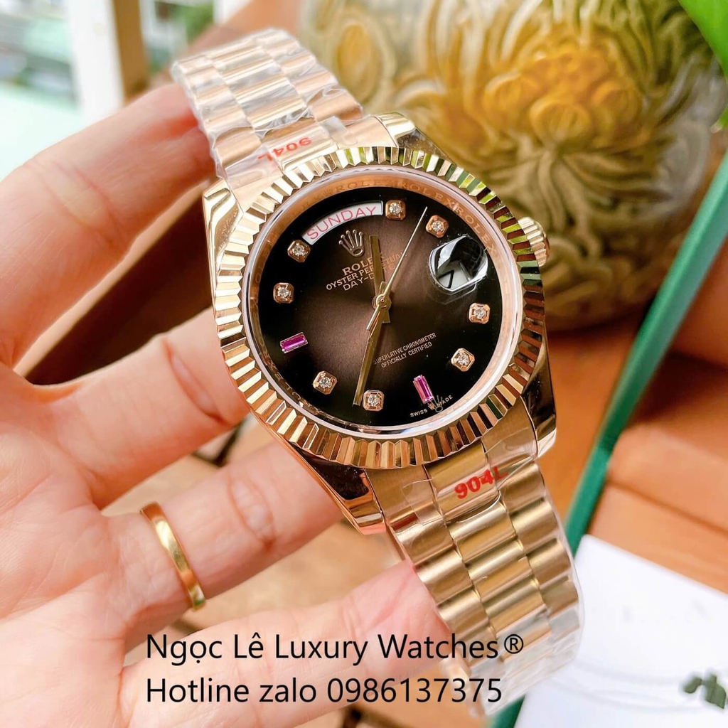 Đồng Hồ Nam Rolex Day-Date Tự Động Dây Thép Vàng Hồng Mặt Nâu 41mm Niềng Khía Đính Đá Cao Cấp