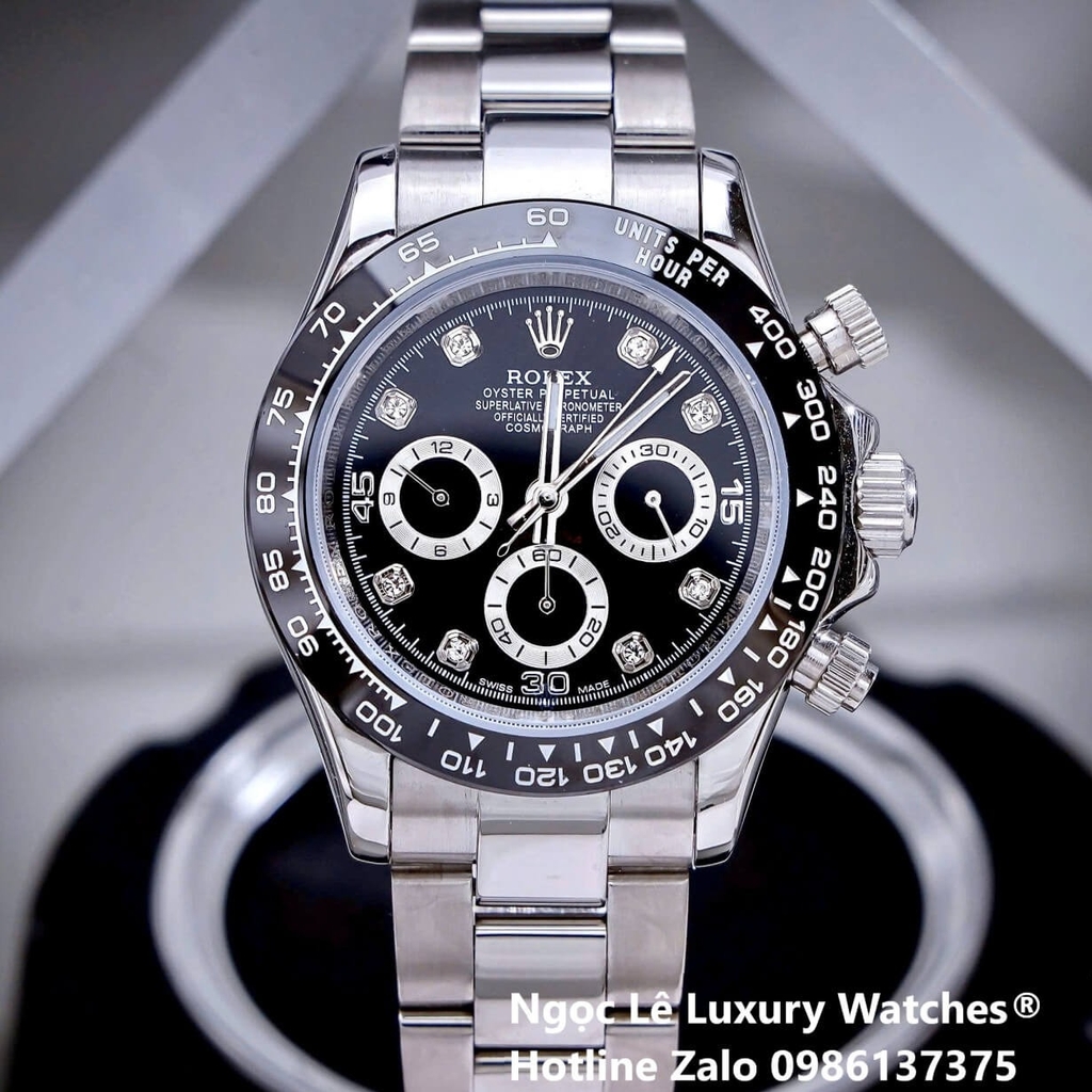 Mẫu Rolex Daytona Automatic với thiết kế dây kim loại silver sang trọng, mặt đen viền đen mạnh mẽ. Điểm nhấn đặc biệt nằm ở 12 viên đá đính tại vị trí cọc số, vừa tạo sự đẳng cấp vừa giúp chiếc đồng hồ thêm cuốn hút. Kim giờ và kim phút phản quang hỗ trợ xem giờ rõ nét trong mọi điều kiện ánh sáng.
