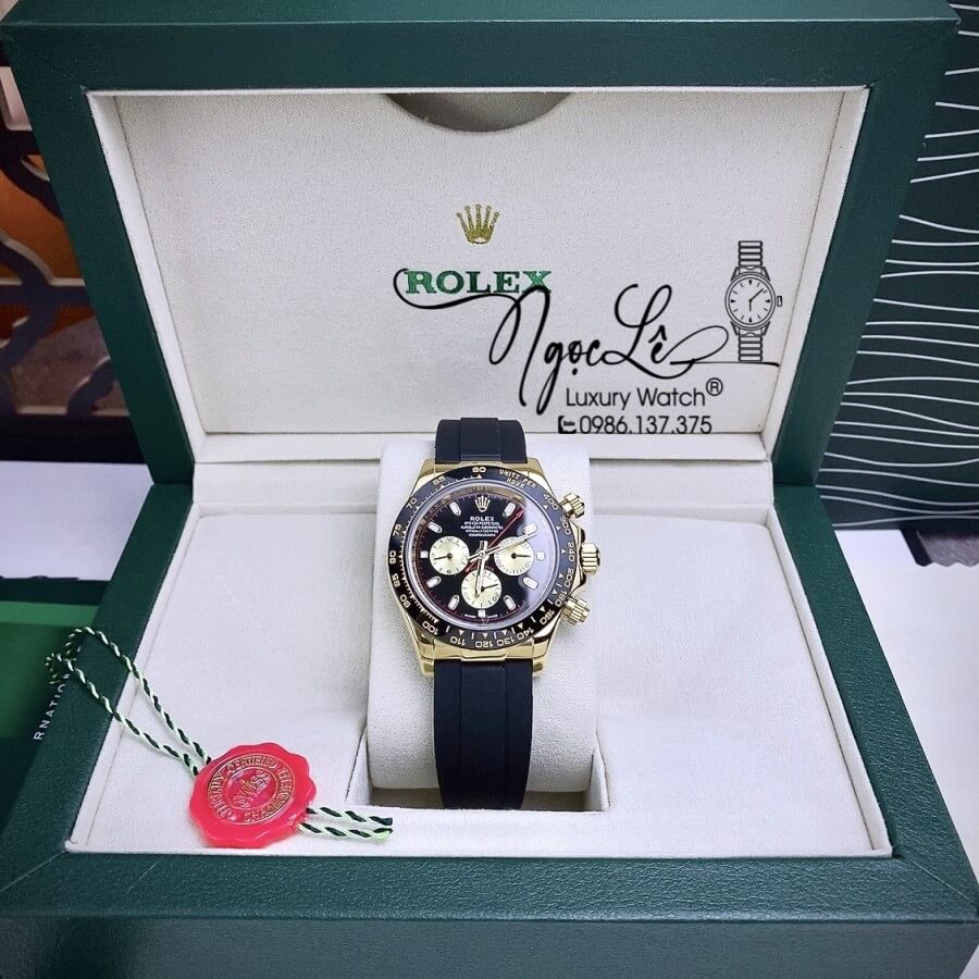 Đồng Hồ Rolex Daytona Automatic Nam Dây Silicon Đen Mặt Đen Vỏ Vàng Size 40mm