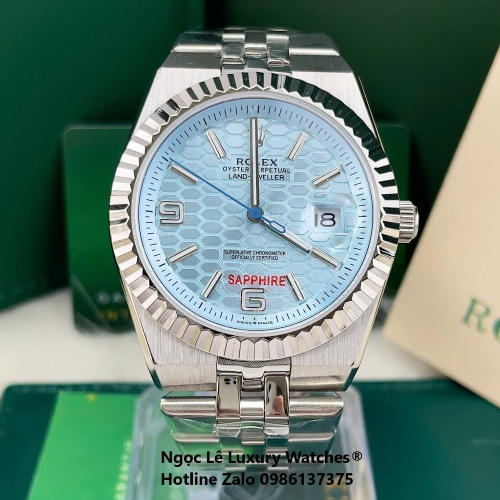 Mẫu Rolex Land-Dweller dây kim loại bạc mặt xanh dương nhạt gây ấn tượng với thiết kế sang trọng, đậm chất thể thao. Vành khía mạnh mẽ cùng mặt số xanh dương nhạt tinh tế, lịch ngày tiện dụng mang đến vẻ ngoài hiện đại nhưng vẫn thanh lịch – lựa chọn hoàn hảo cho quý ông yêu thích sự khác biệt.
