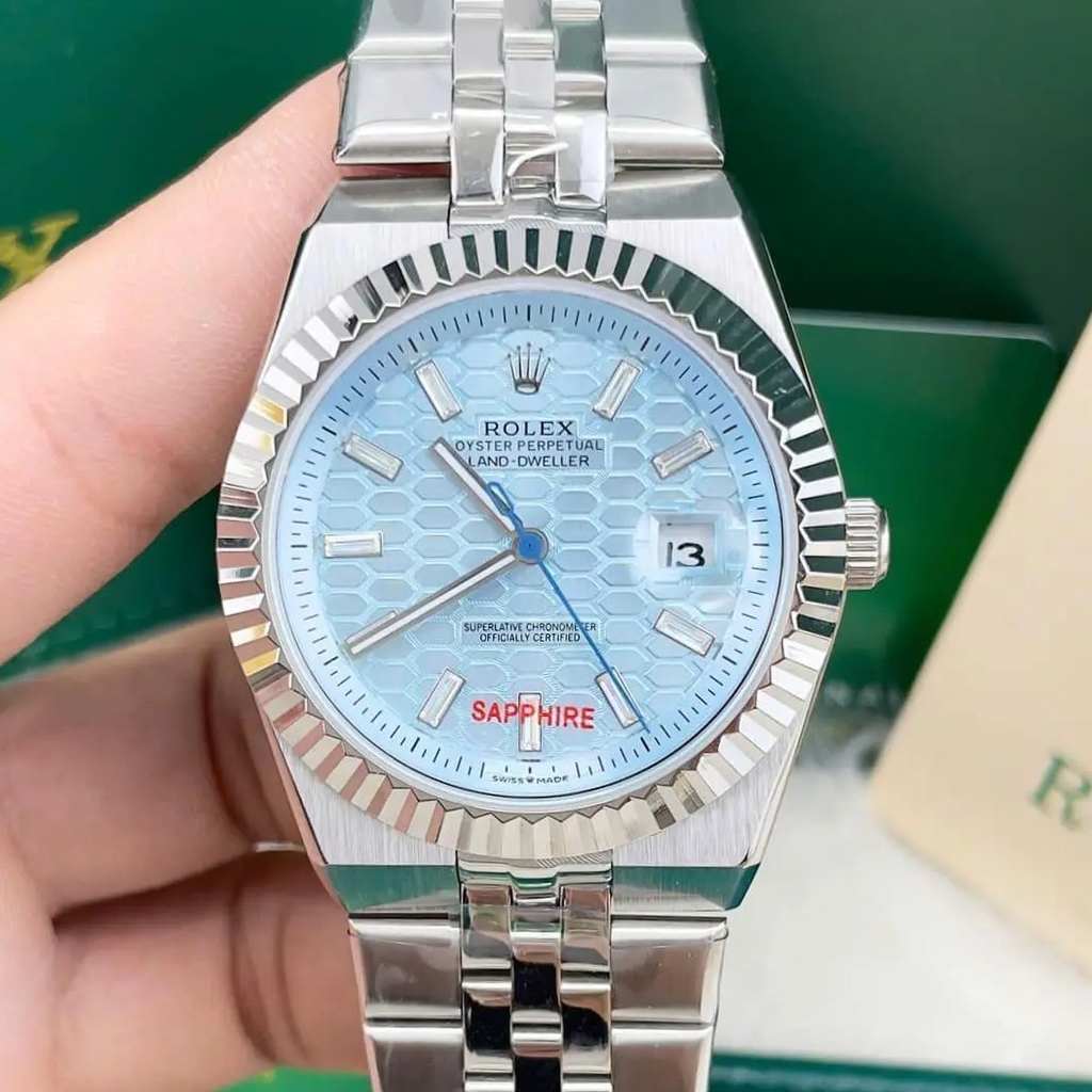 Đồng Hồ Rolex Land-Dweller Dây Kim Loại Bạc Mặt Xanh Dương Nhạt Họa Tiết Tổ Ong Size 40mm Vành Khía