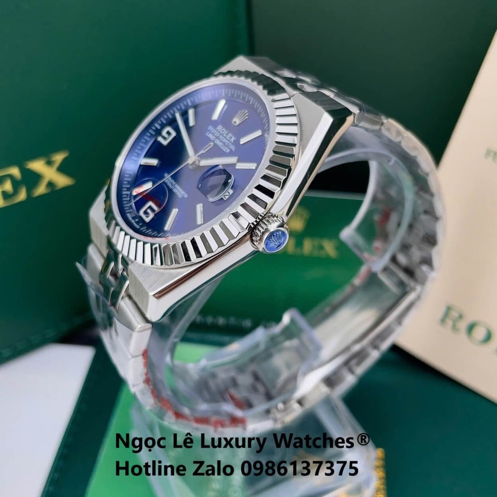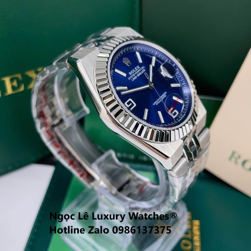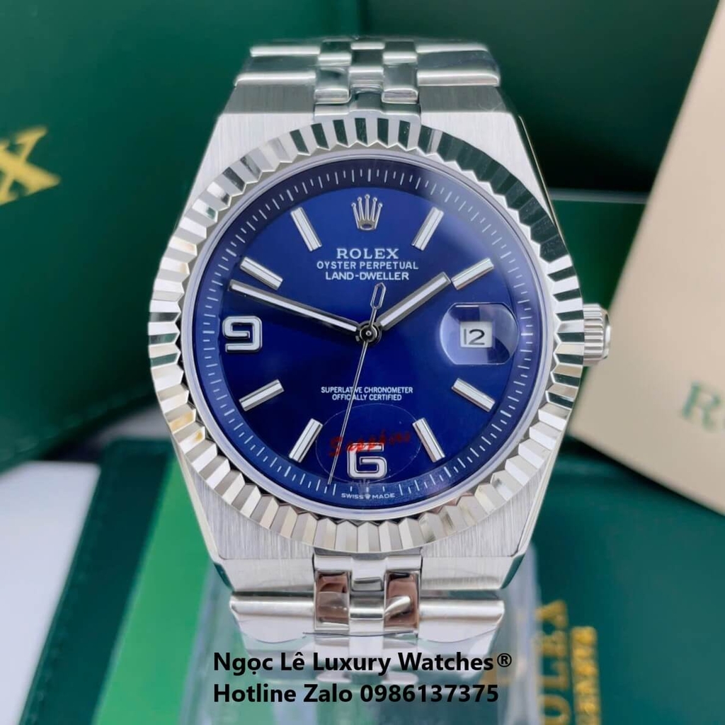 Đồng Hồ Rolex Land-Dweller Dây Kim Loại Bạc Mặt Xanh Dương Size 40mm Vành Khía