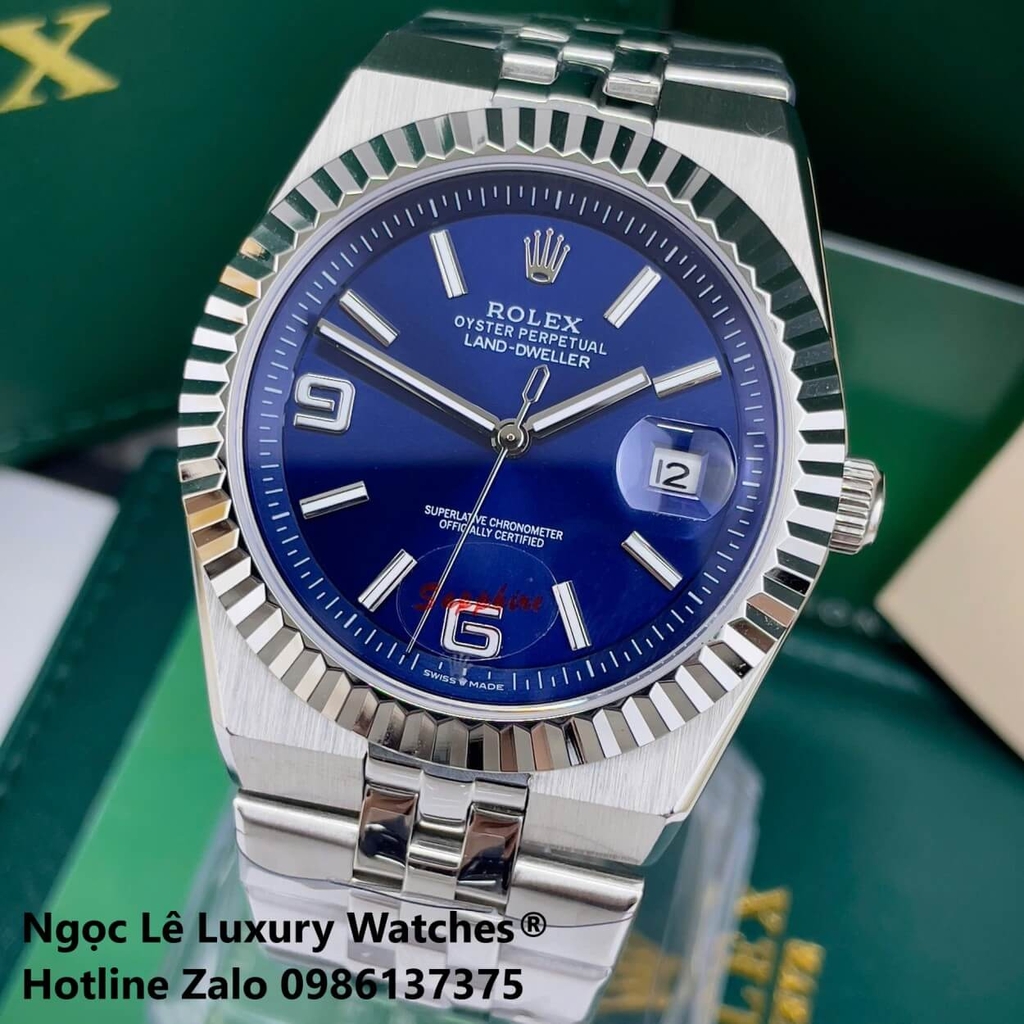 Hình ảnh Đồng Hồ Rolex Land-Dweller Dây Kim Loại Bạc Mặt Xanh Dương Size 40mm Vành Khía
