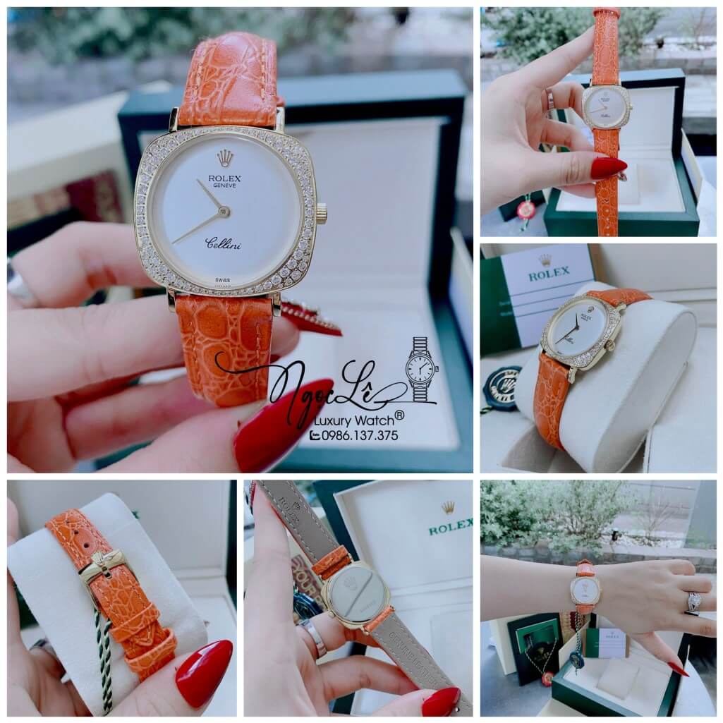 Đồng Hồ Rolex Nữ Mặt Đính Đá Dây Da Màu Cam Vỏ Gold 33mm - Rolex Cellini