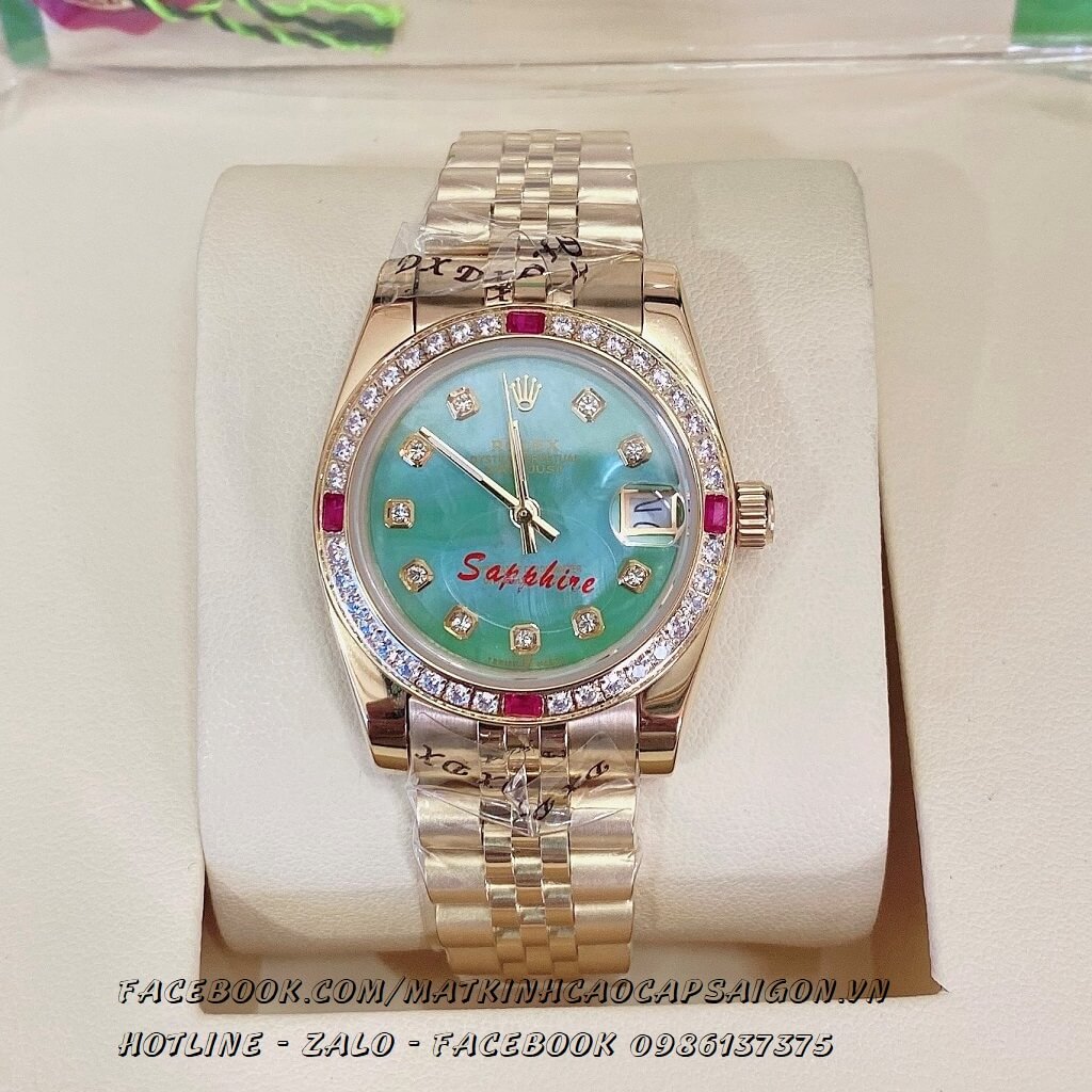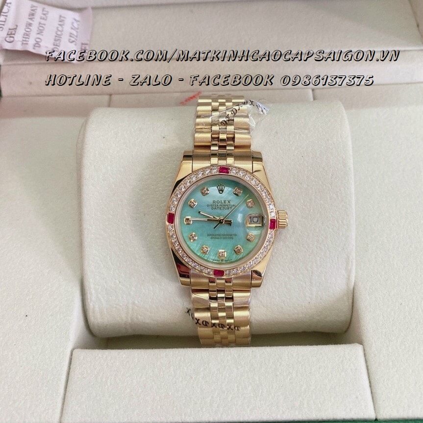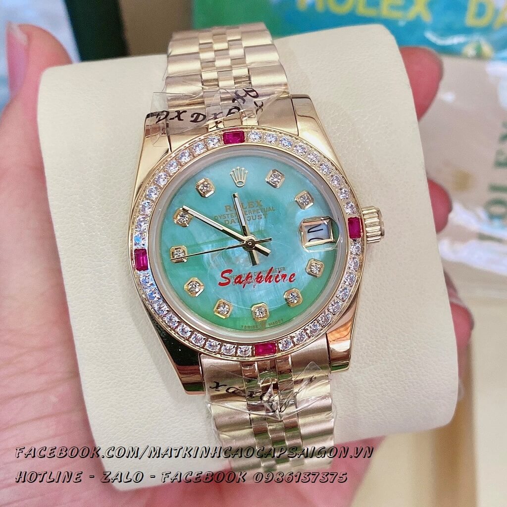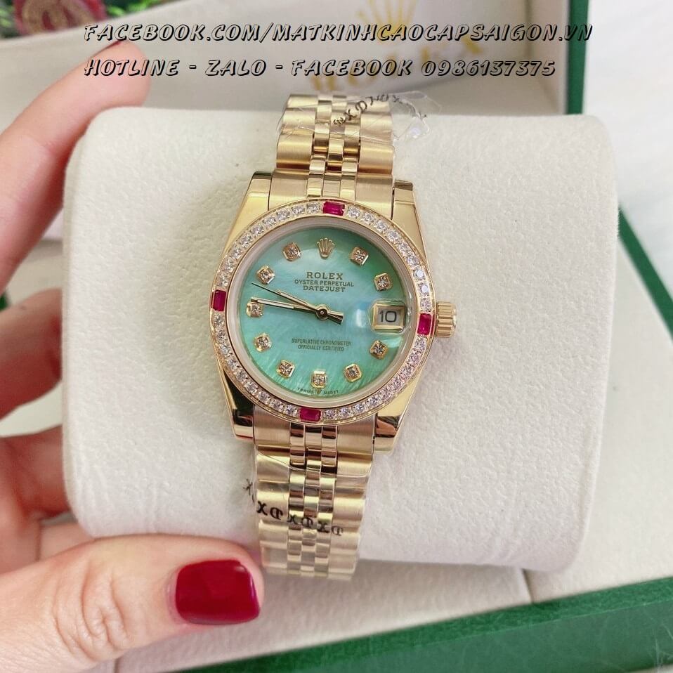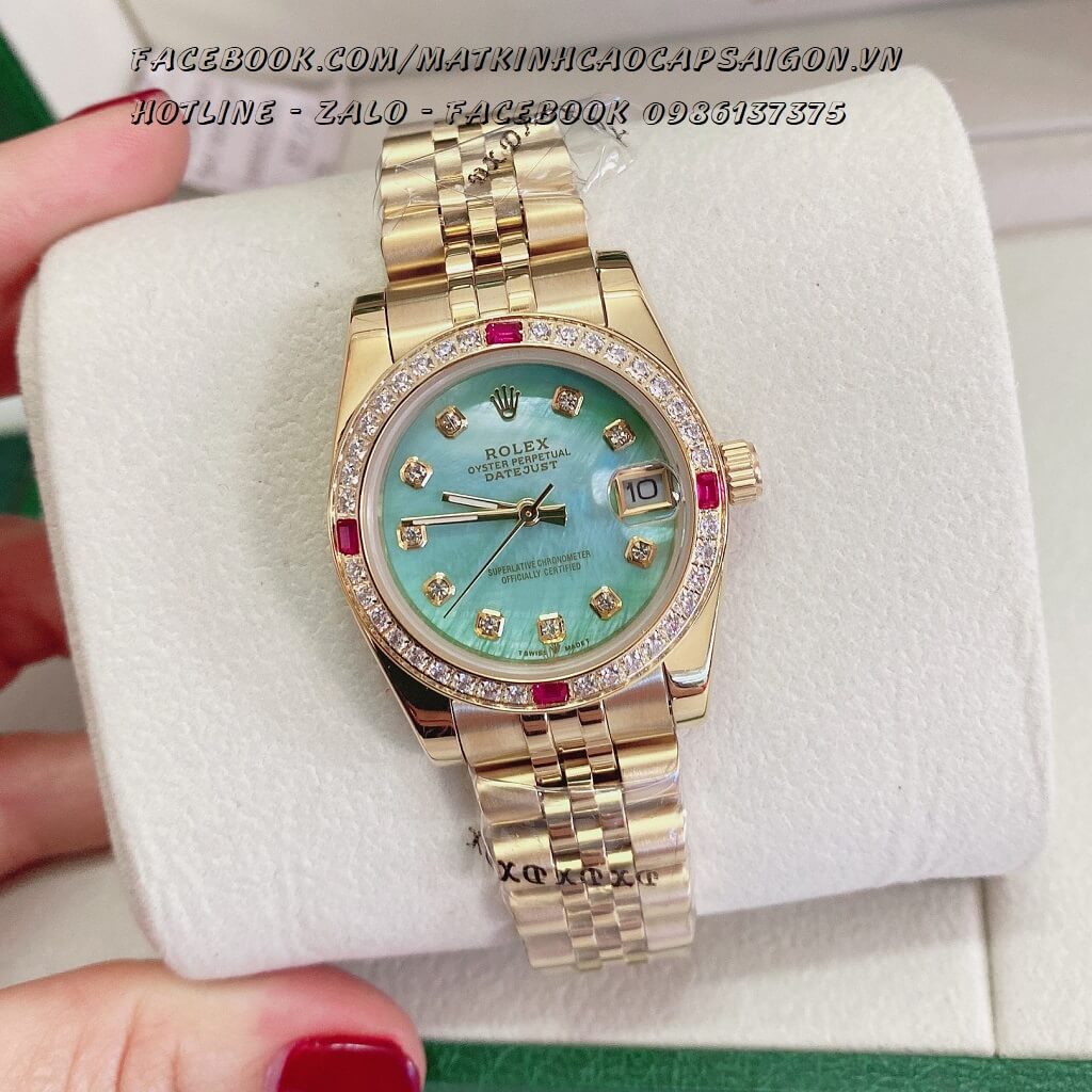 Đồng Hồ Rolex Quartz Nữ Đính Đá Vàng Mặt Xanh Ngọc 32mm