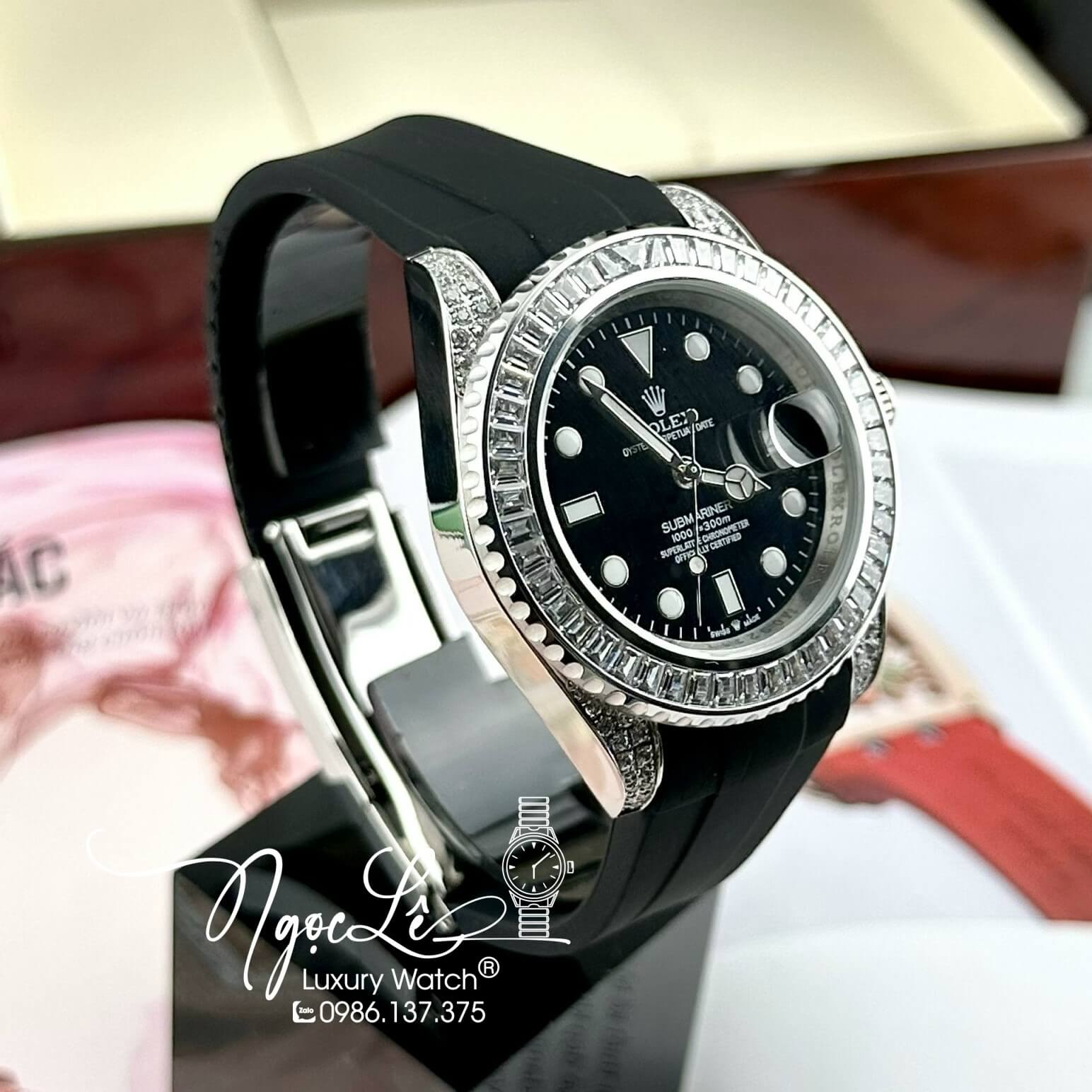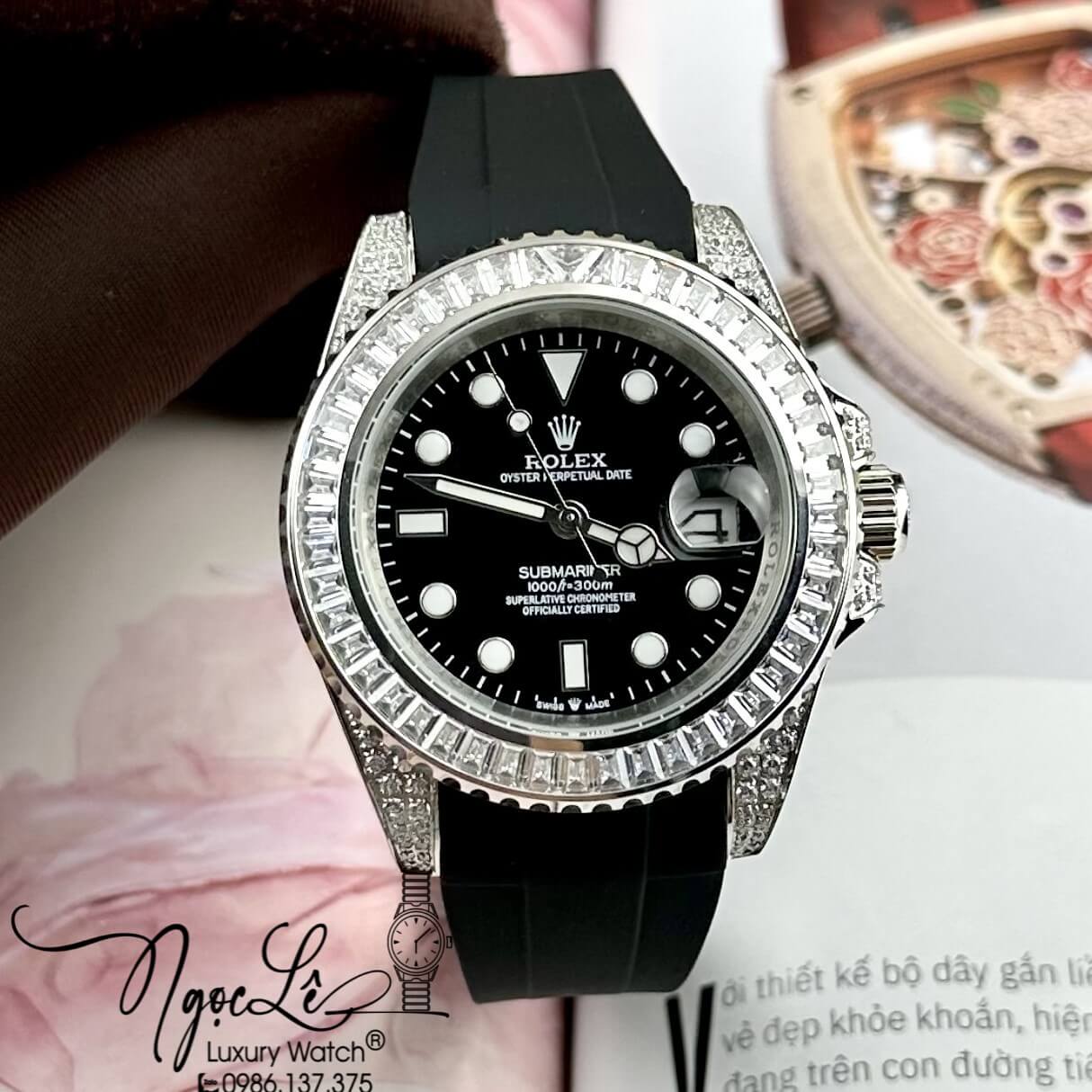 Đồng Hồ Rolex Submariner Automatic Nam Dây Cao Su Đen Đính Đá Vỏ Silver Size 41mm