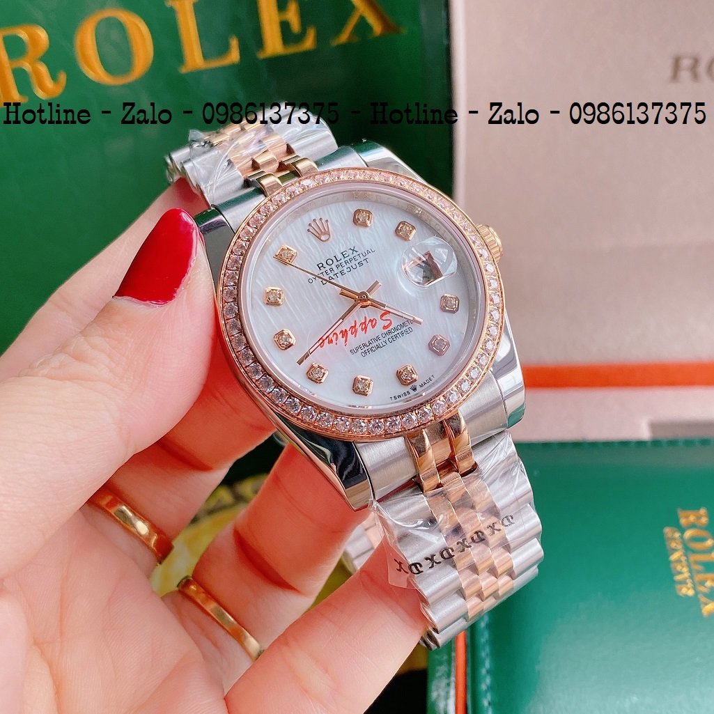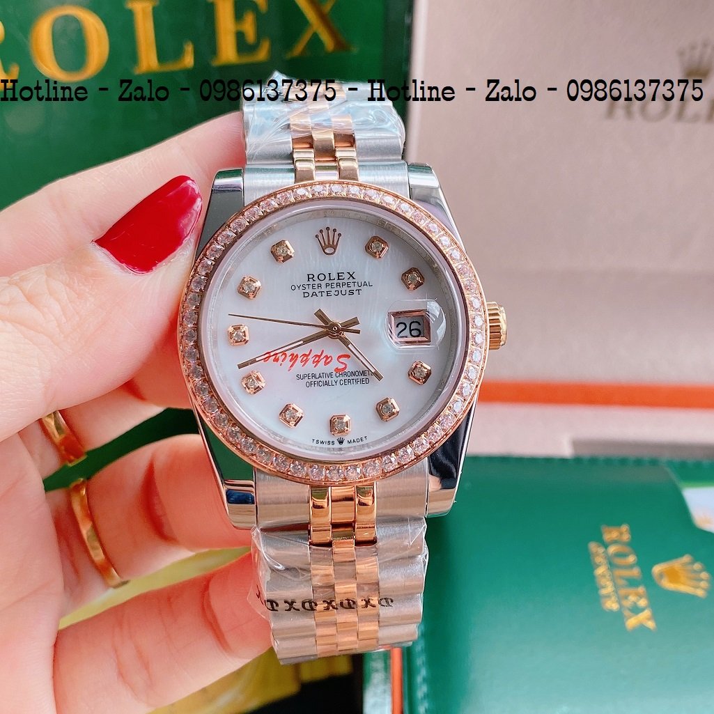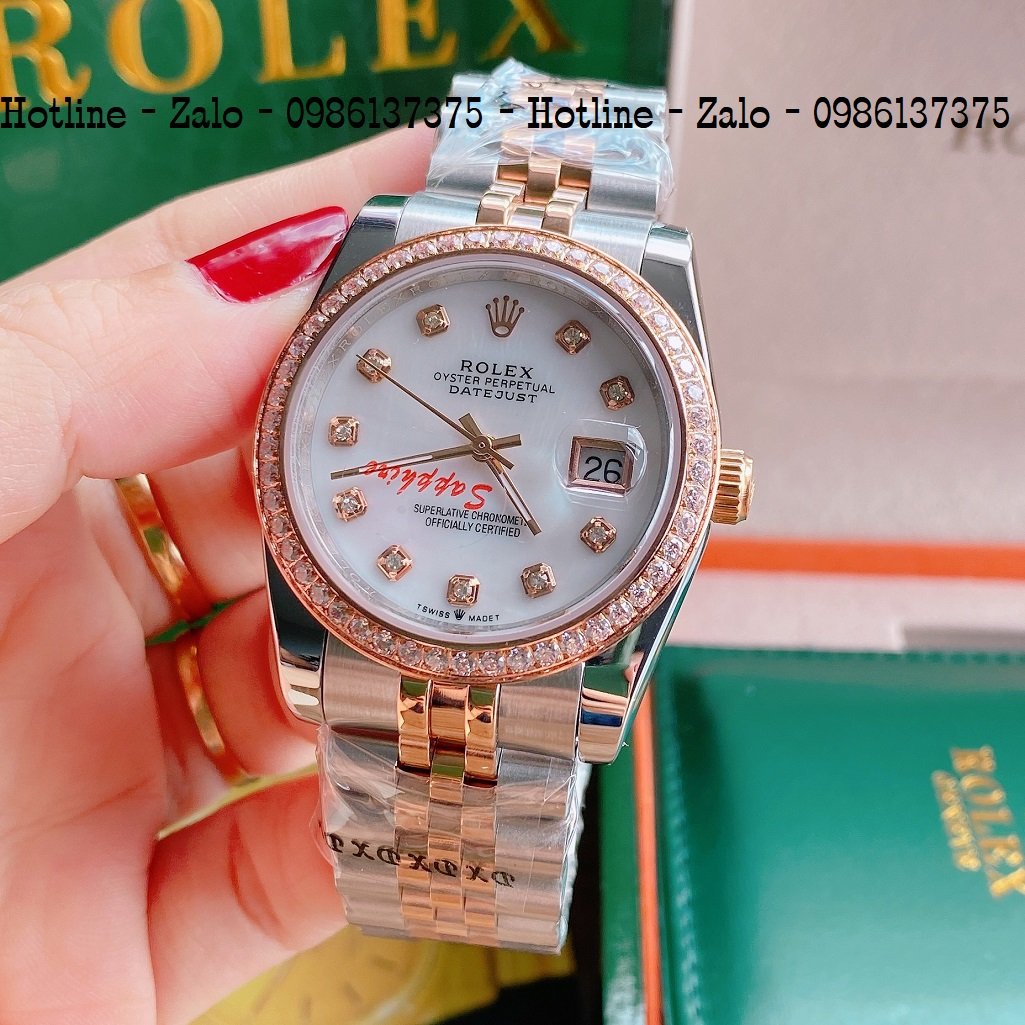 - Đồng Hồ Unisex Rolex Viền Đá Dây Demi Mặt Trắng Ngọc 36mm