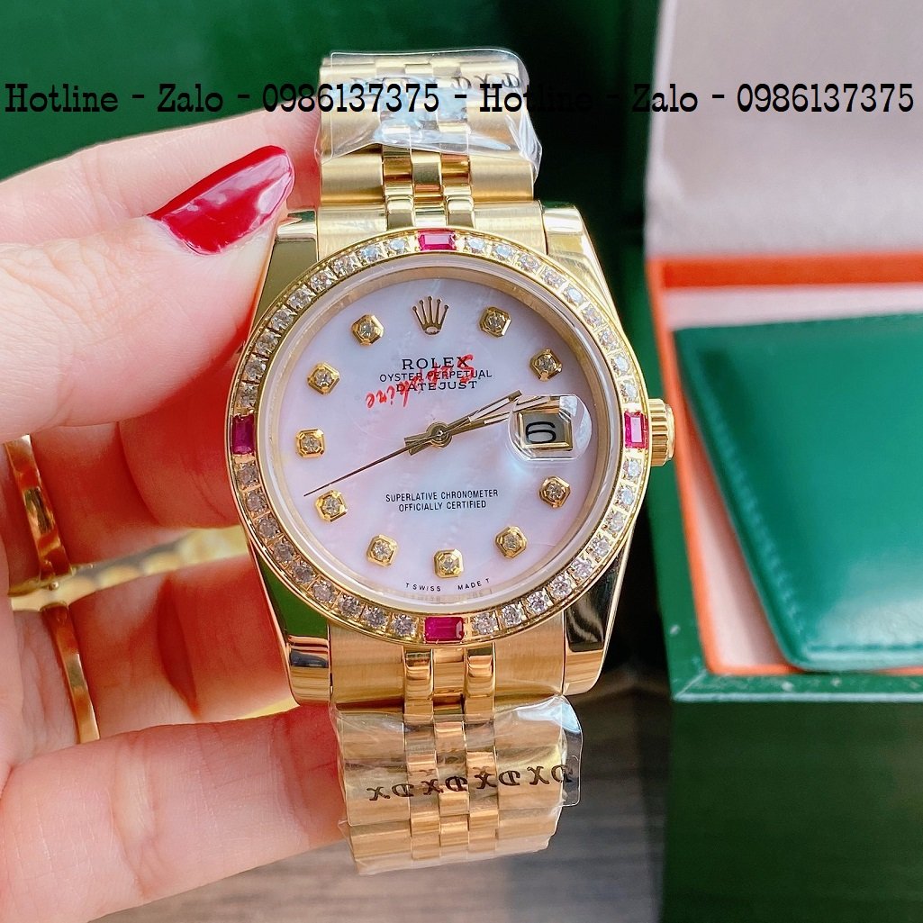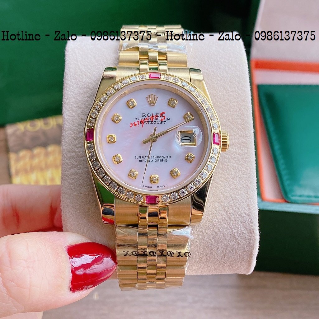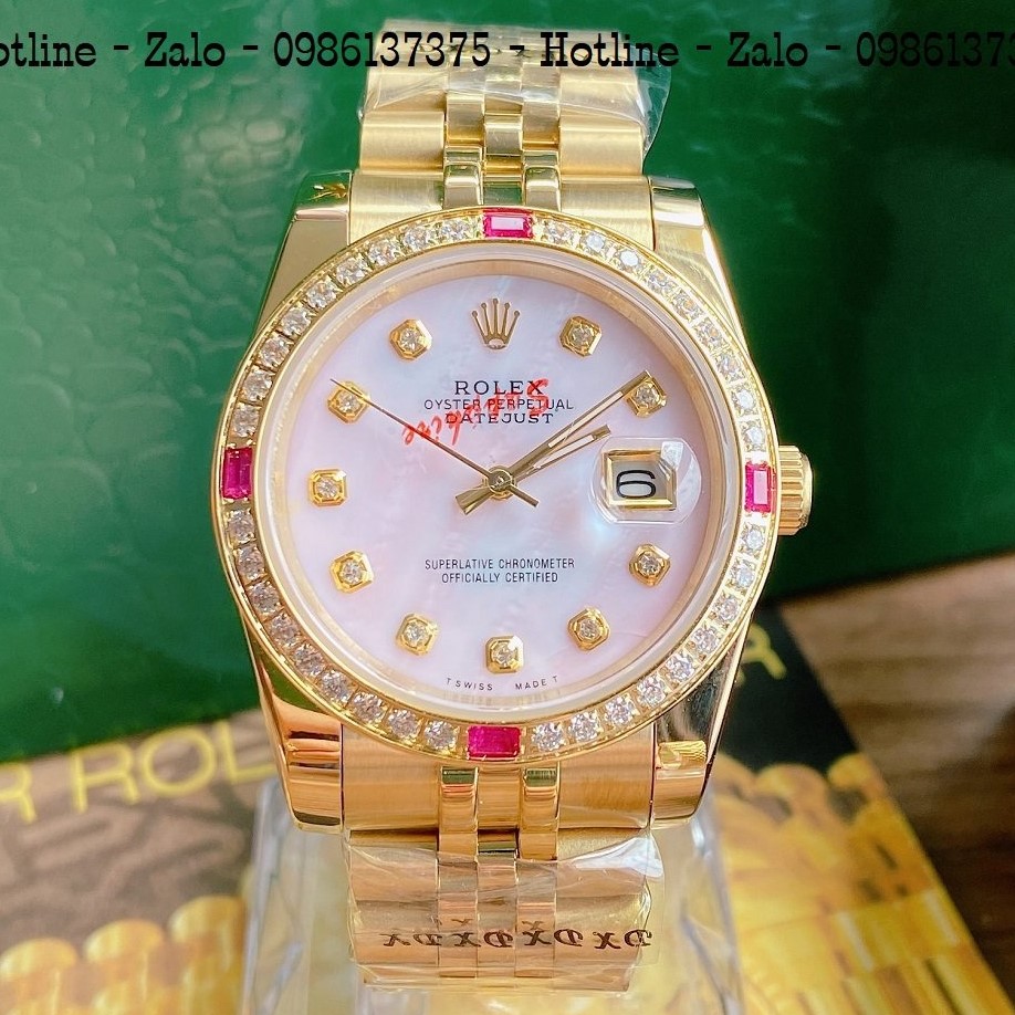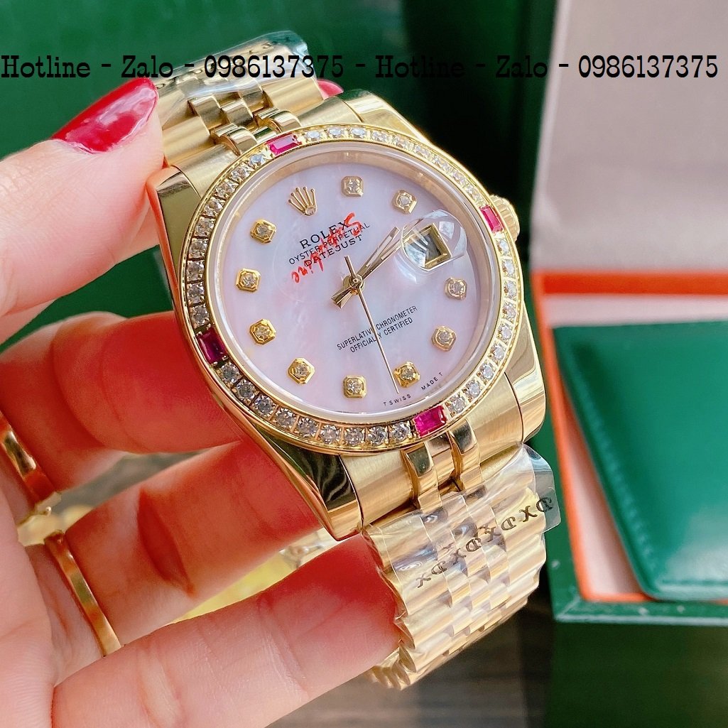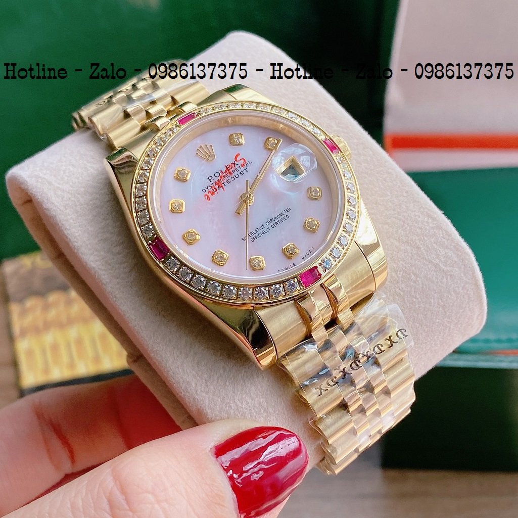 - Đồng Hồ Unisex Rolex Viền Đá Dây Vàng Mặt Hồng Ngọc 36mm