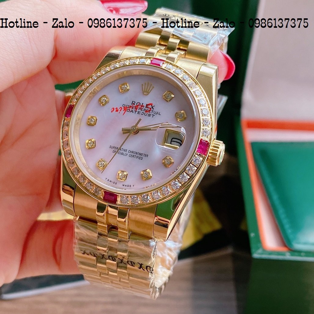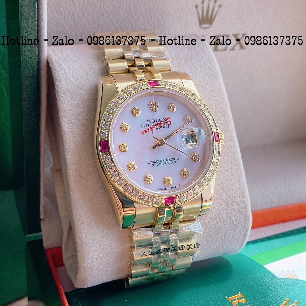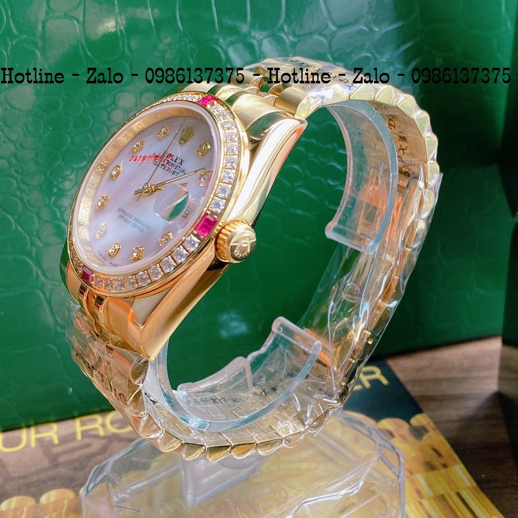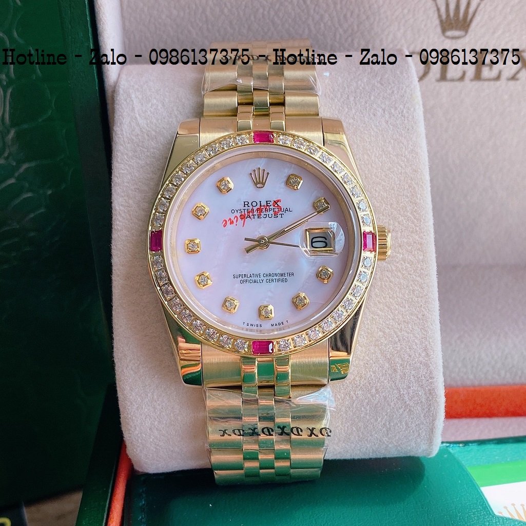- Đồng Hồ Unisex Rolex Viền Đá Dây Vàng Mặt Hồng Ngọc 36mm