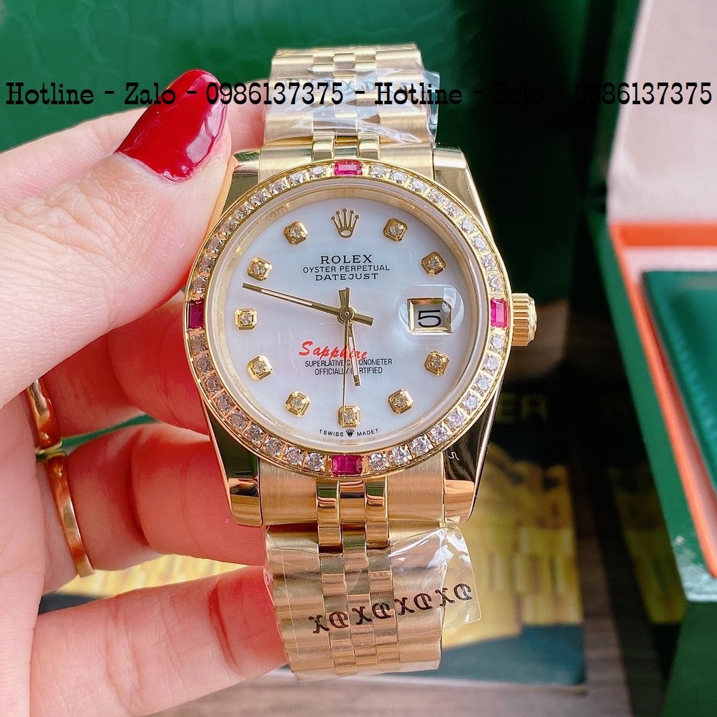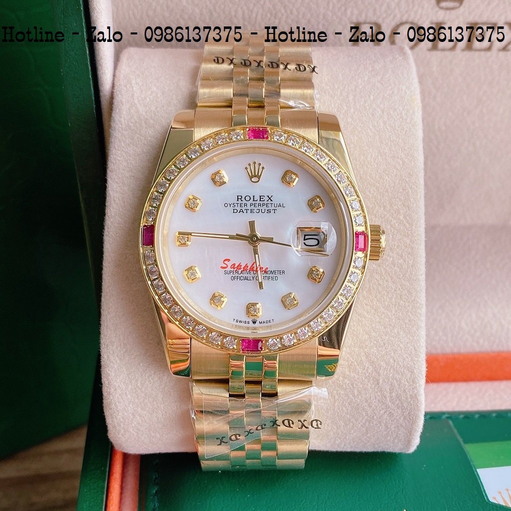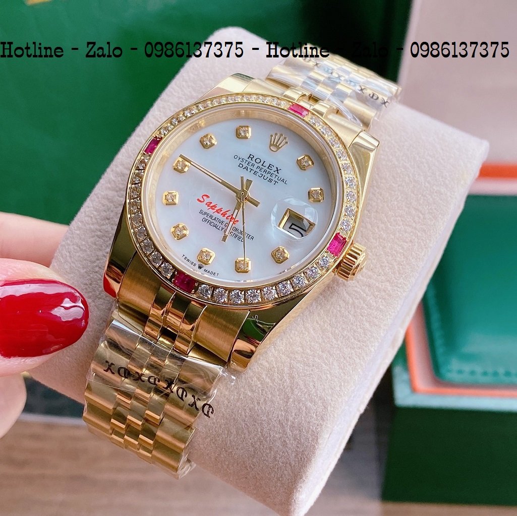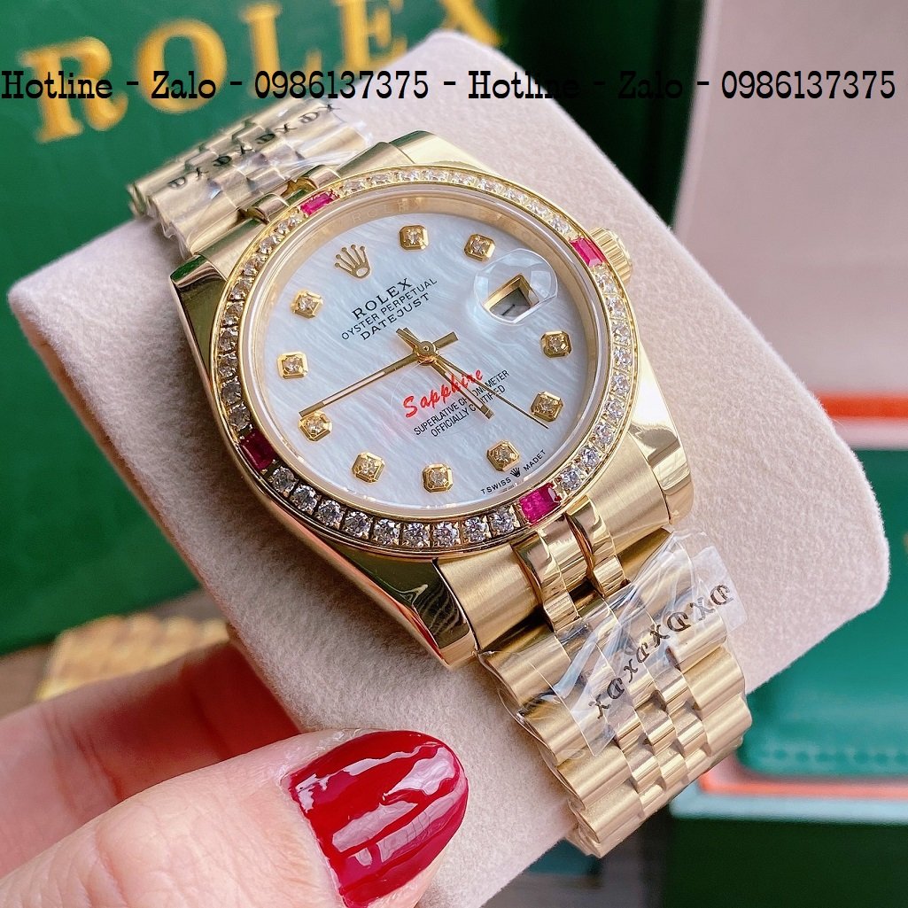 - Đồng Hồ Unisex Rolex Viền Đá Dây Vàng Mặt Trắng Ngọc 36mm