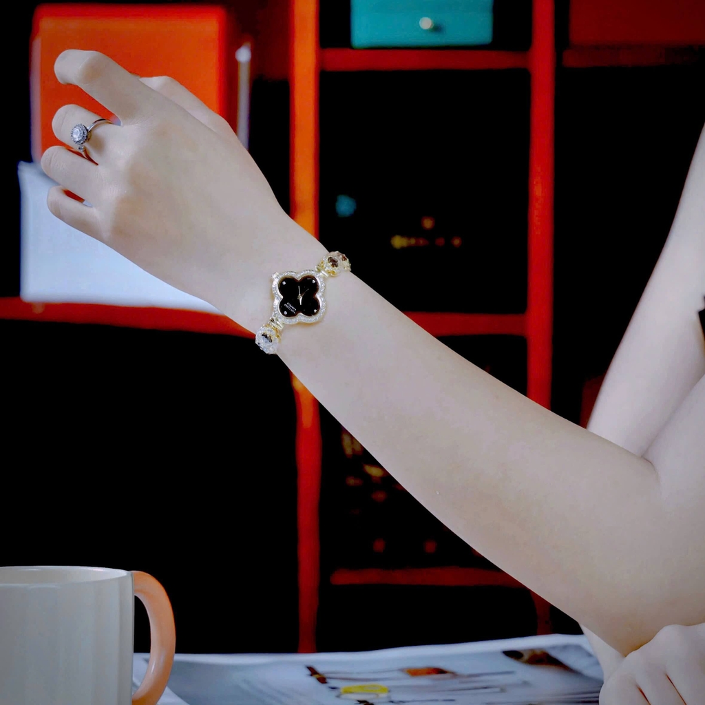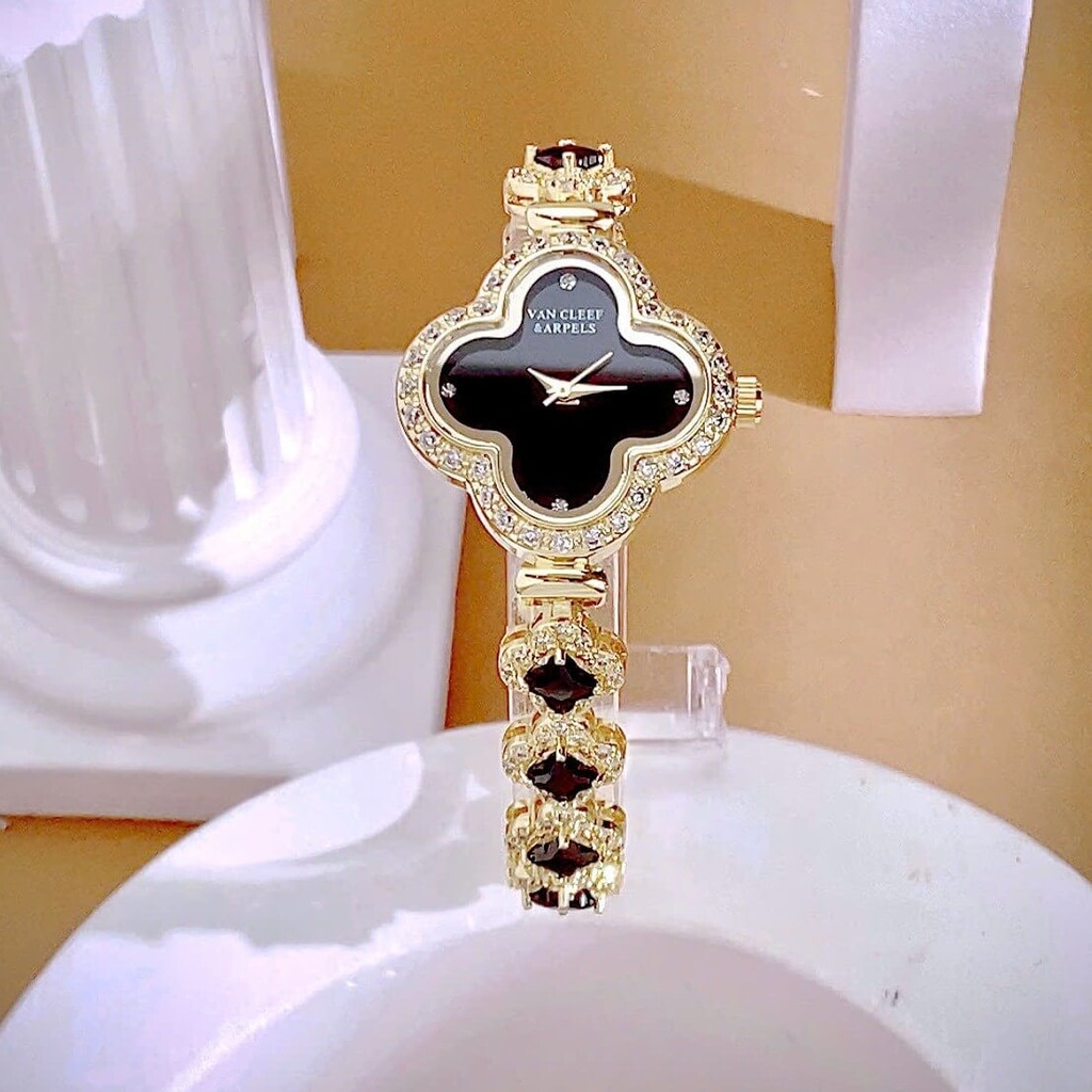 Đồng Hồ Van Cleef & Arpels Nữ Dây Lắc Tay Cỏ 4 Lá Vỏ Vàng Hoa Đen Size 27mm