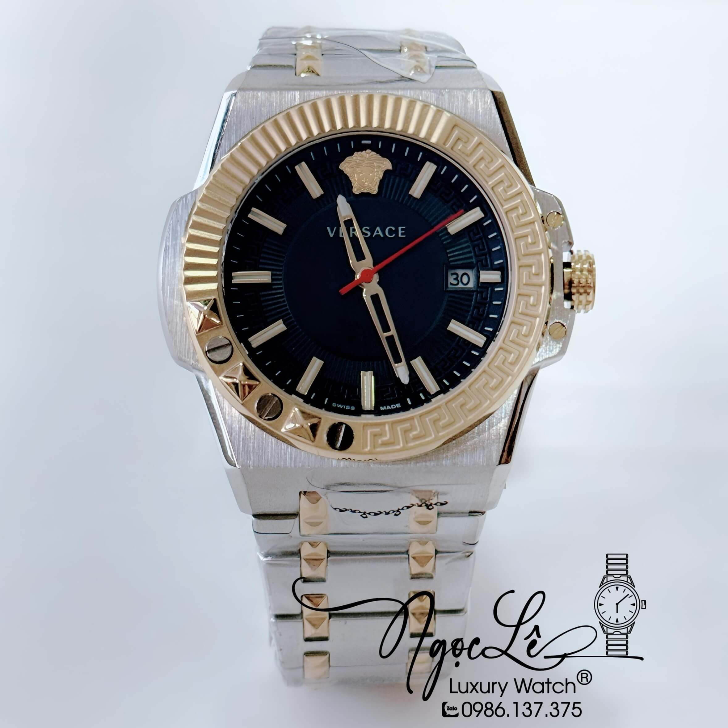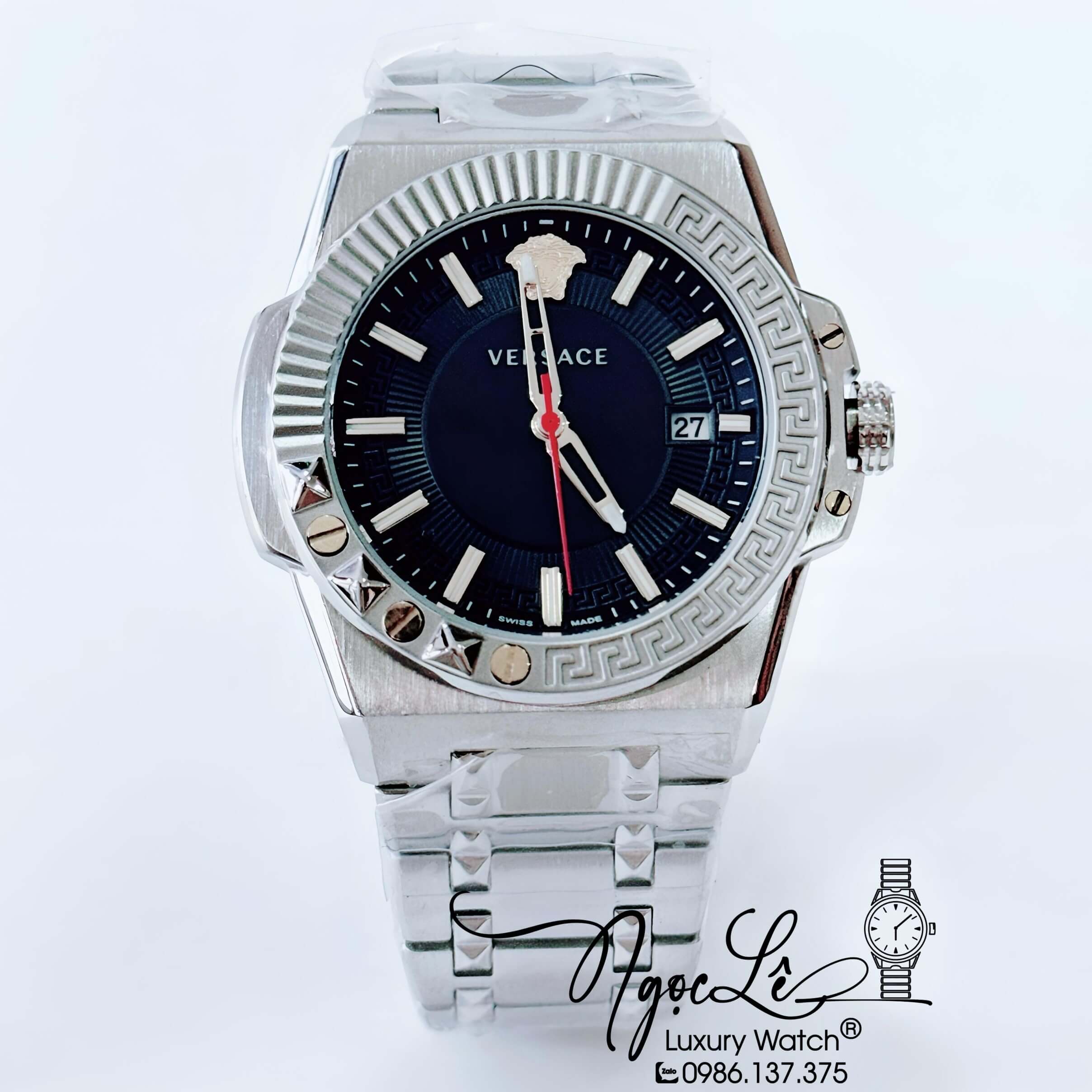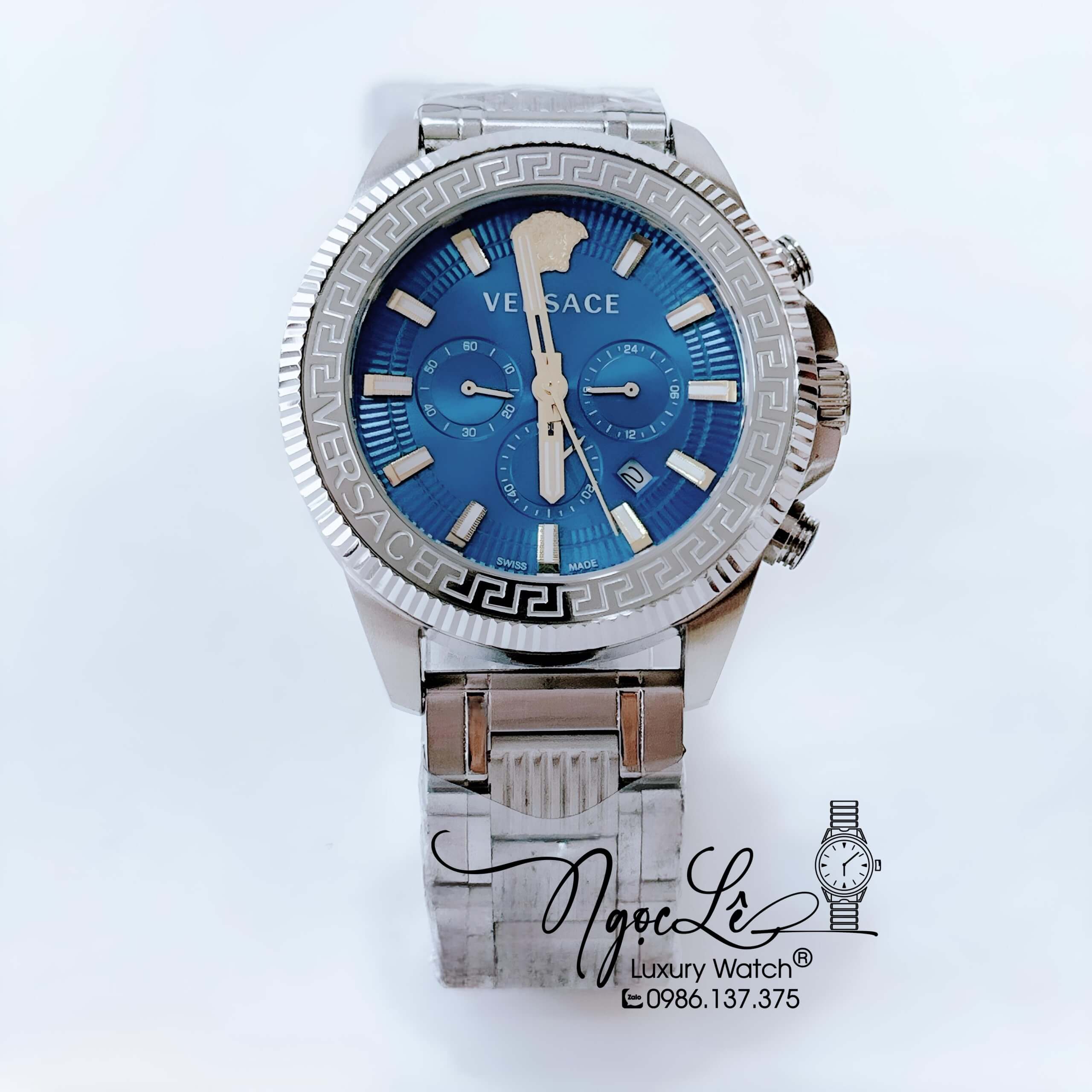 Đồng Hồ Nam Versace Greca Action Dây Kim Loại Màu Bạc Mặt Xanh Dương Size 44mm