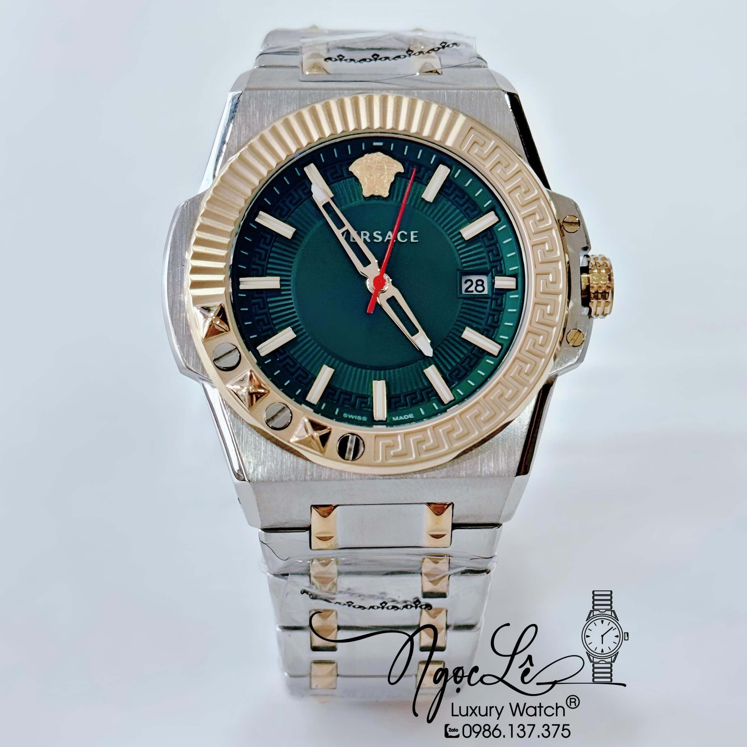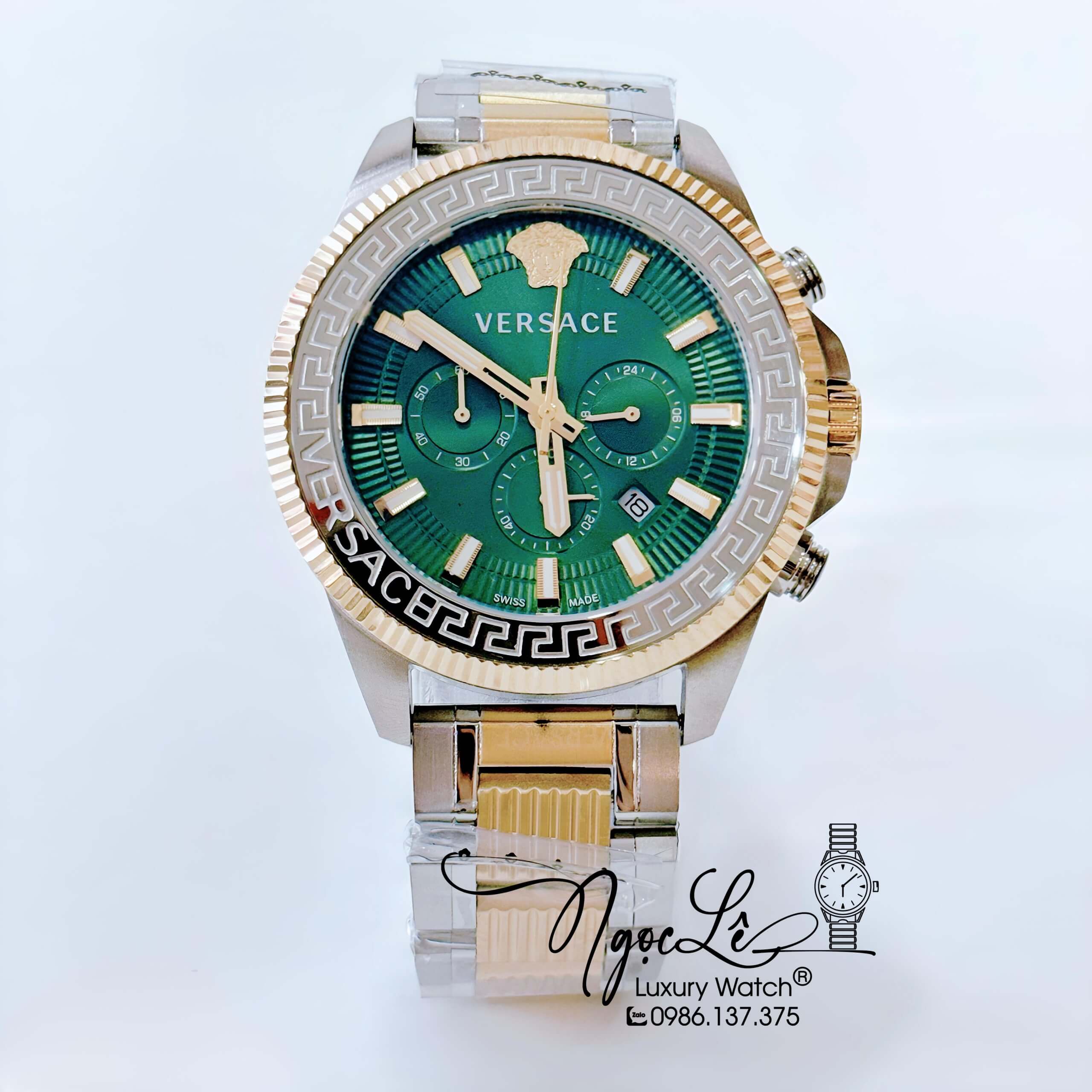 Đồng Hồ Nam Versace Greca Action Dây Kim Loại Demi Vàng Mặt Xanh Lá Size 44mm