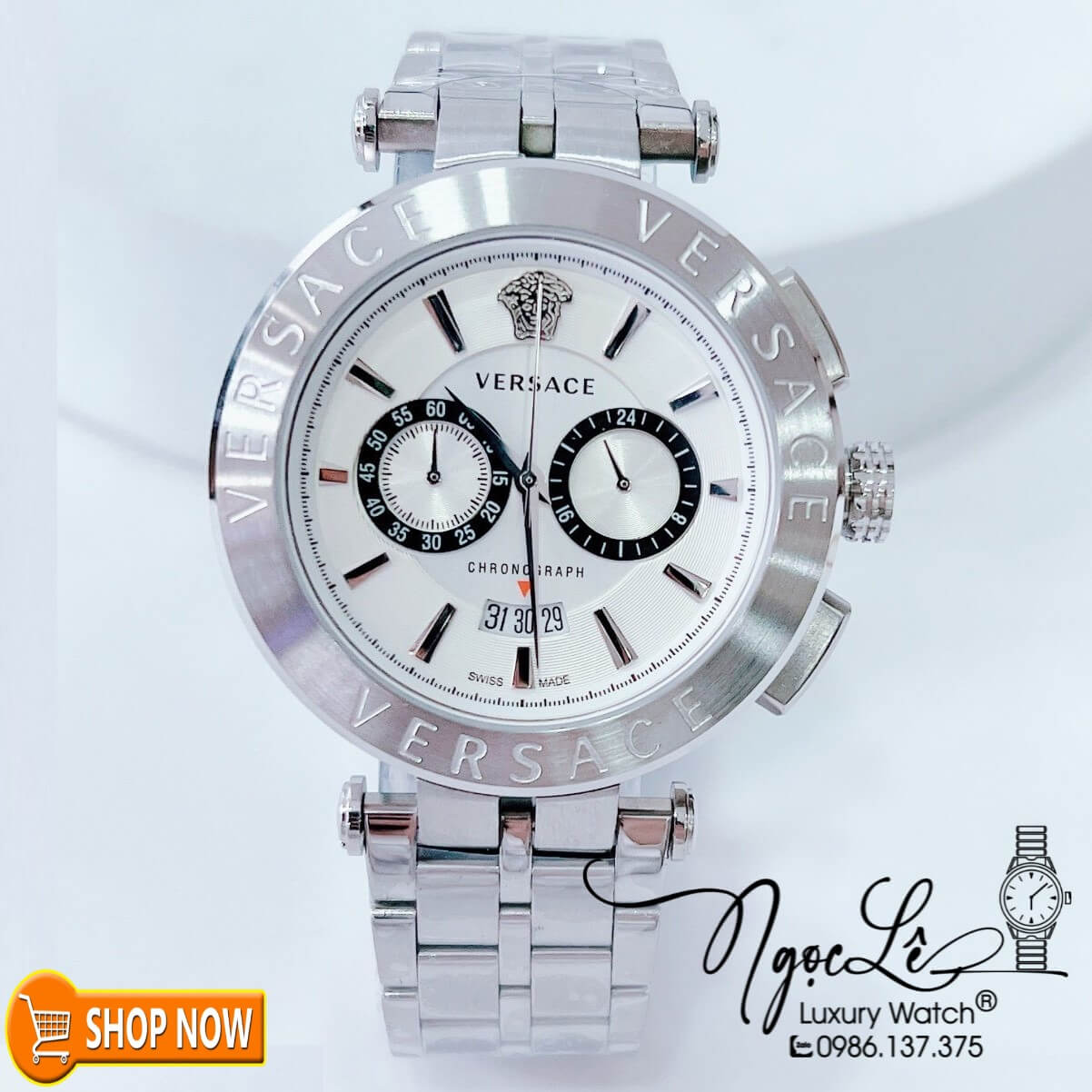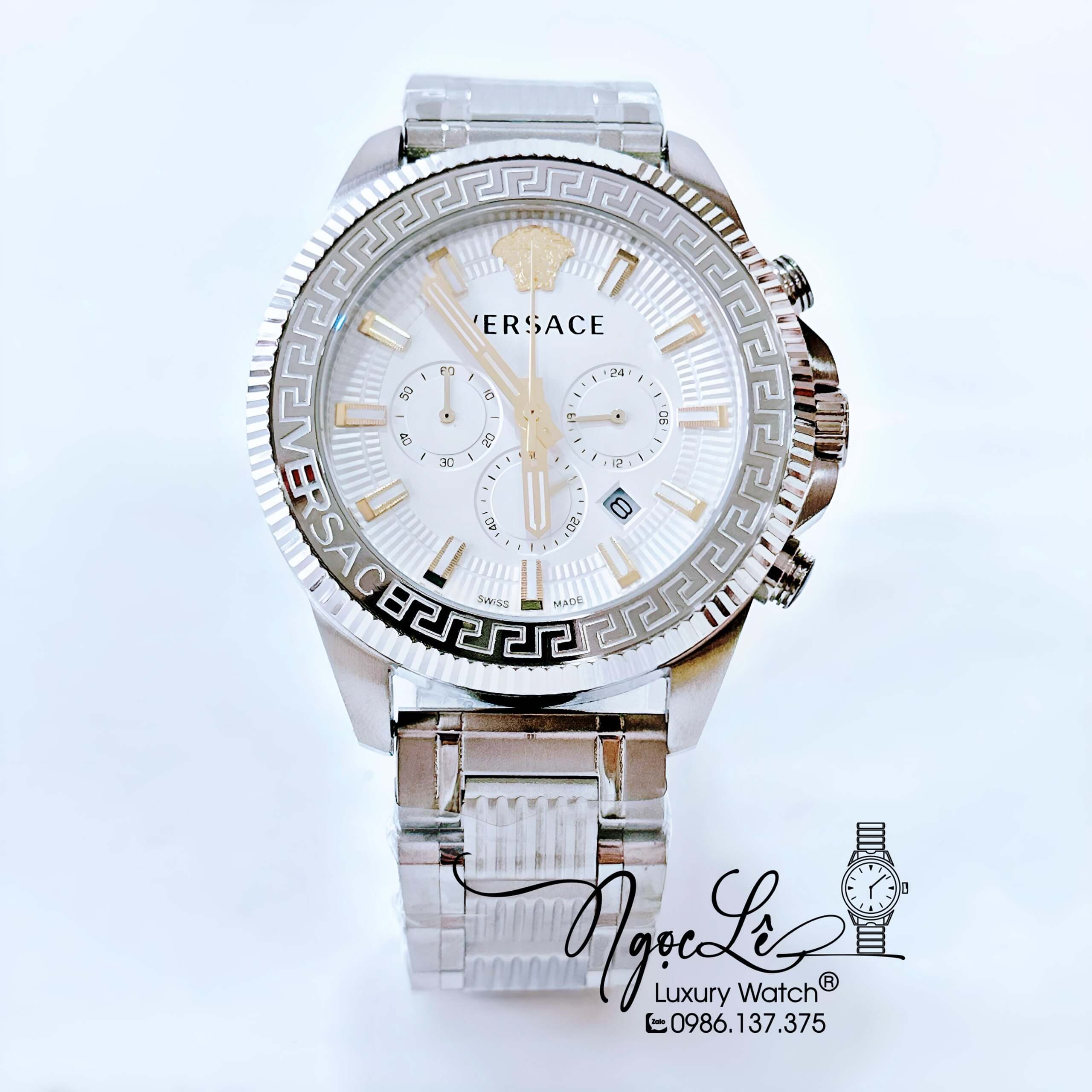 Đồng Hồ Nam Versace Greca Logo Chronograph Dây Thép Mặt Trắng Silver Size 43mm