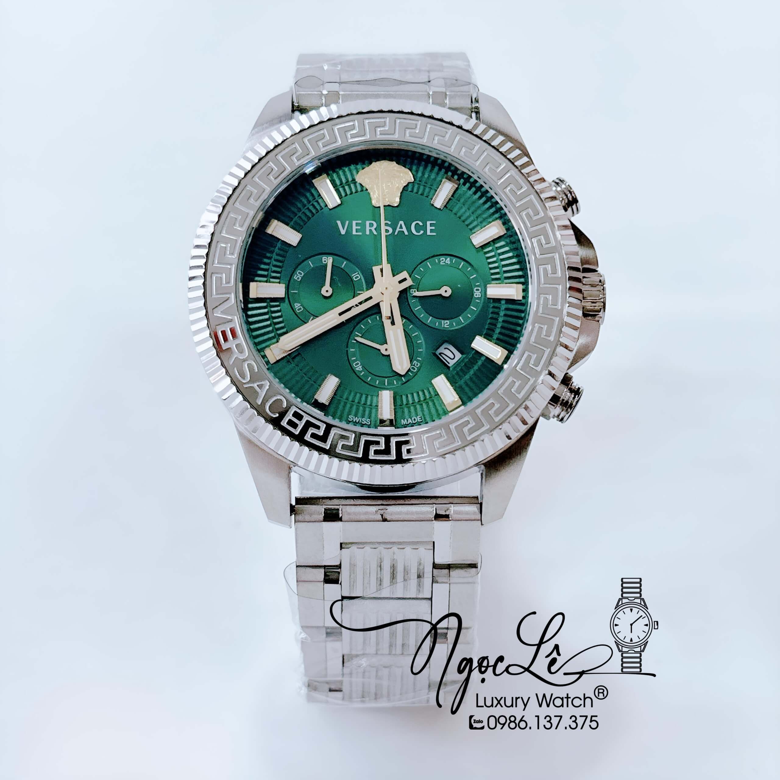Đồng Hồ Nam Versace Greca Action Dây Kim Loại Màu Bạc Mặt Xanh Lá Size 44mm