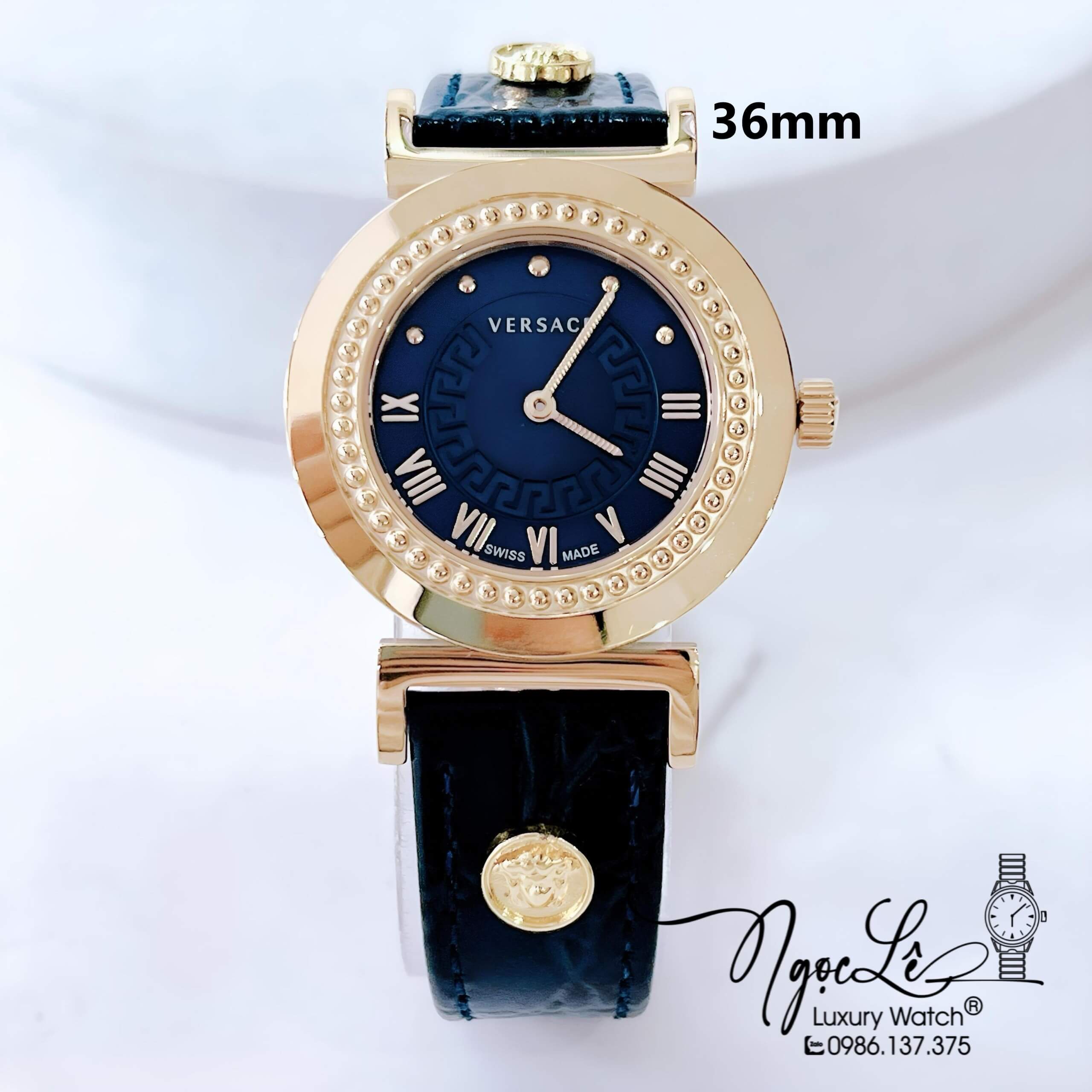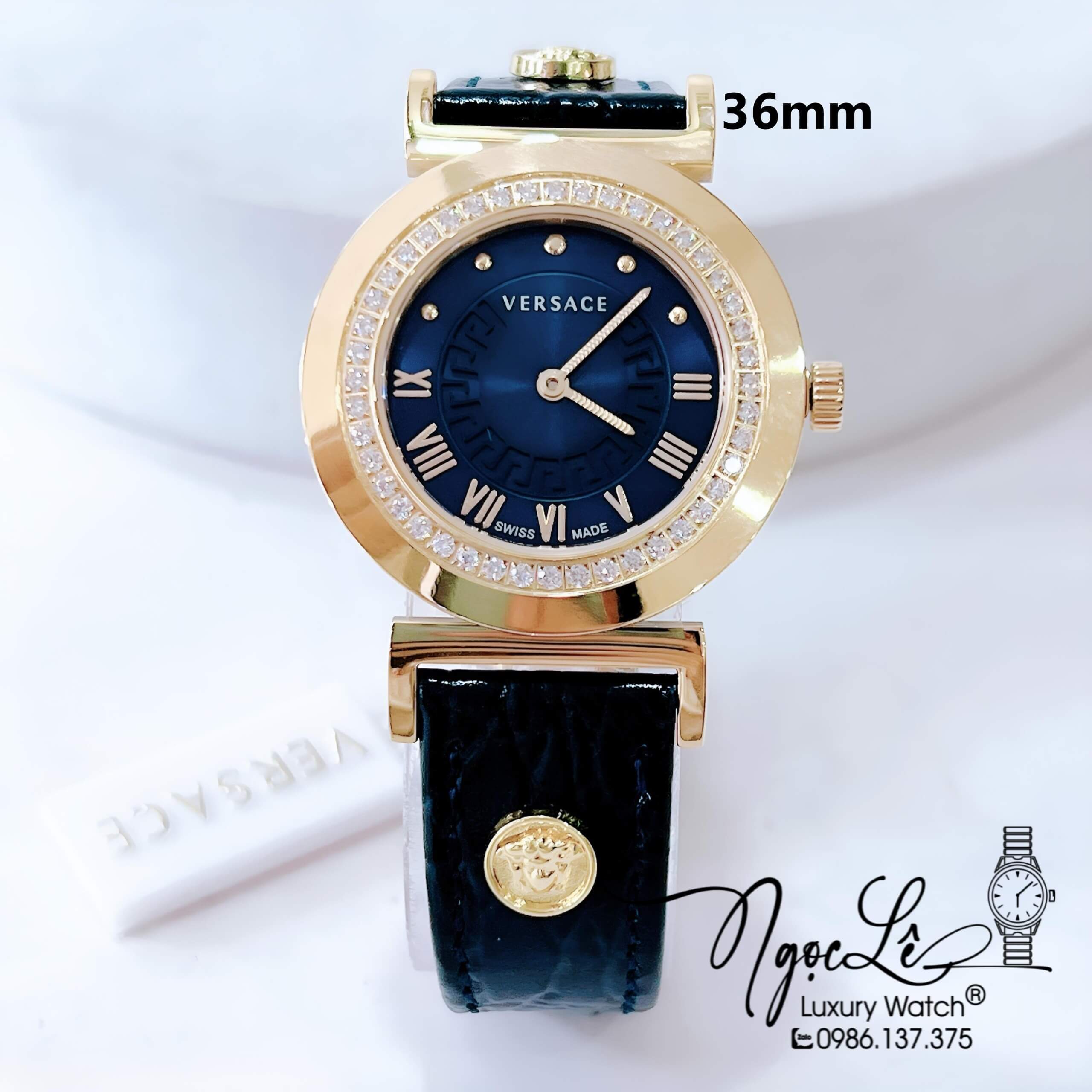 Đồng Hồ Nữ Versace Vanity Máy Thụy Sỹ Dây Da Xanh Dương Đậm Đính Đá Size 35mm