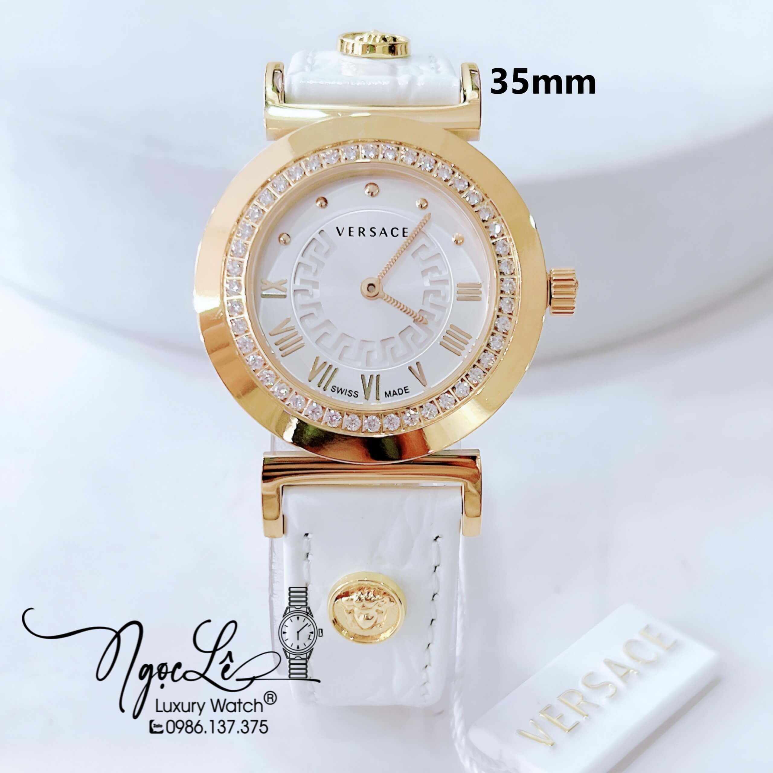 Đồng Hồ Nữ Versace Vanity Máy Thụy Sỹ Dây Da Trắng Đính Đá Size 35mm
